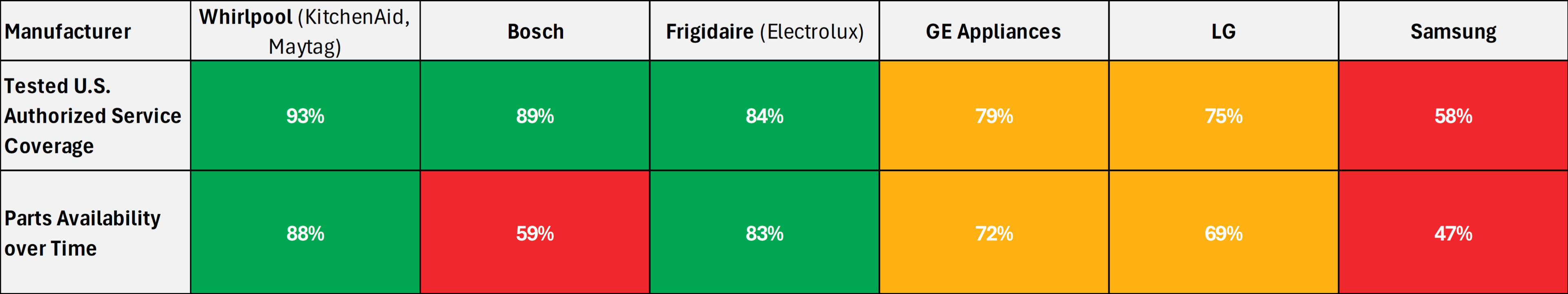 Bearing all of this in mind, we shifted our focus to after-purchase serviceability support. It's often safer to assume when a refrigerator will break down, not if. And when that happens, what really matters is how quickly and easily you can get it running again. To paint a clearer picture of what that means for consumers, we analyzed the authorized service coverage and parts availability across each brand that we've currently tested.