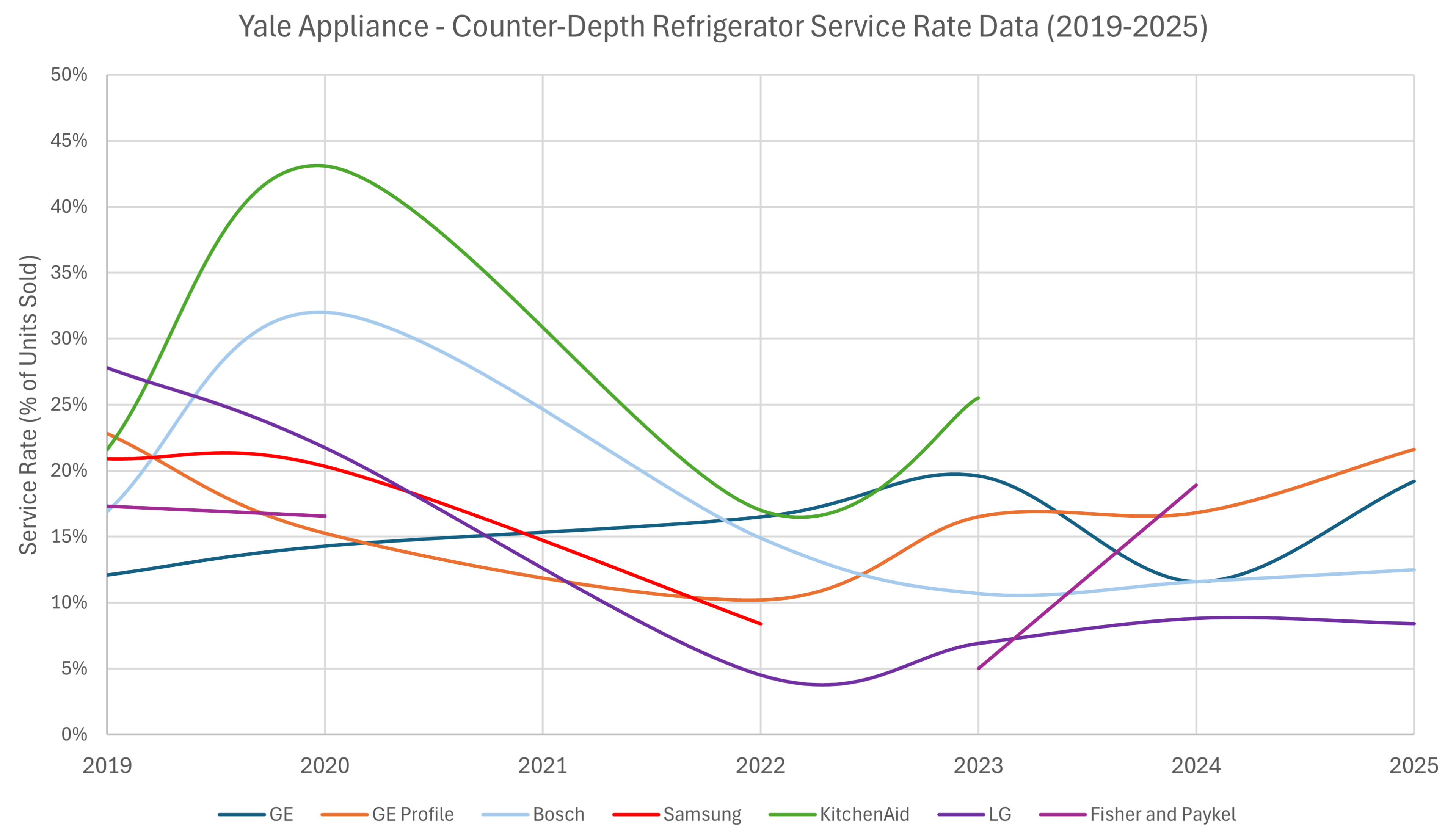 This graph confirms that appliance reliability isn't a linear trend over time. Service rates fluctuate from year to year, and no brand is consistently trouble-free. The takeaway is that consumers rarely get to see concrete, transparent information and data on which to base their decision when choosing a reliable refrigerator.