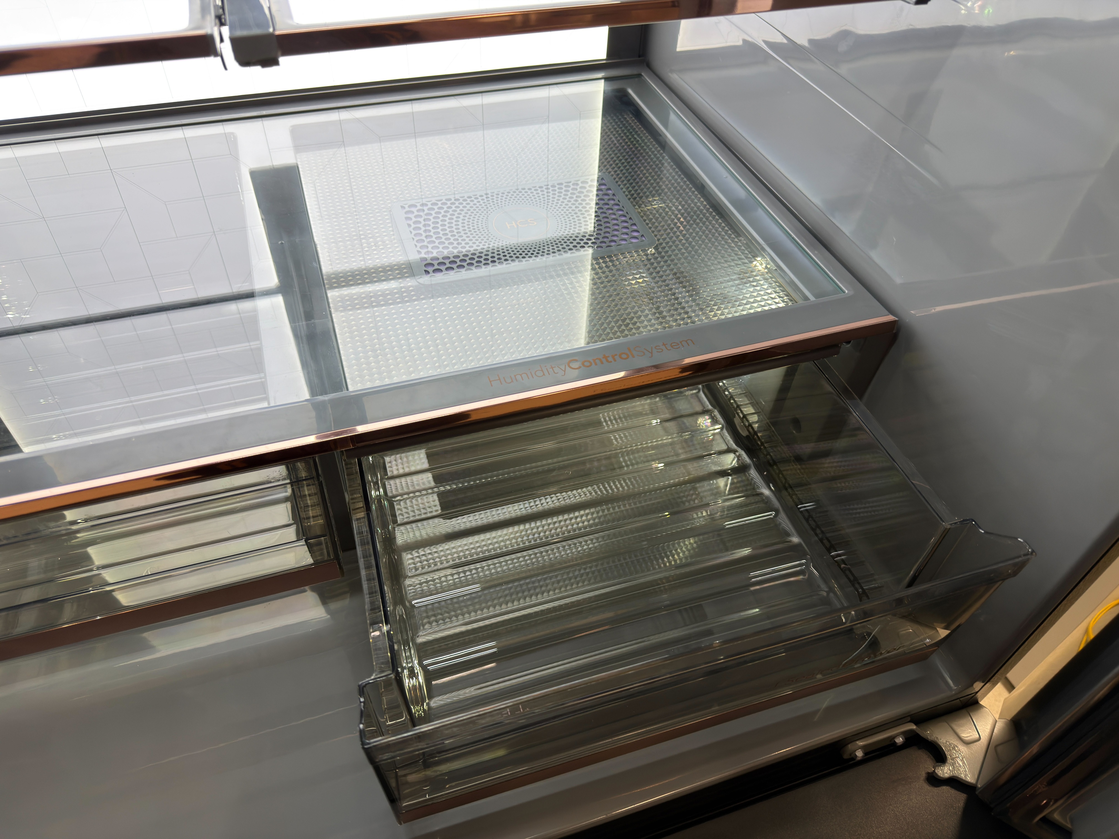 The produce preservation performance is outstanding. The dual evaporators keep humidity in the fridge high, so produce will fare well even outside the crisper drawer. Inside the produce bin, the Humidity Control System seal is remarkably effective at retaining moisture. Produce will stay crisp and wilt-free for a very long time.