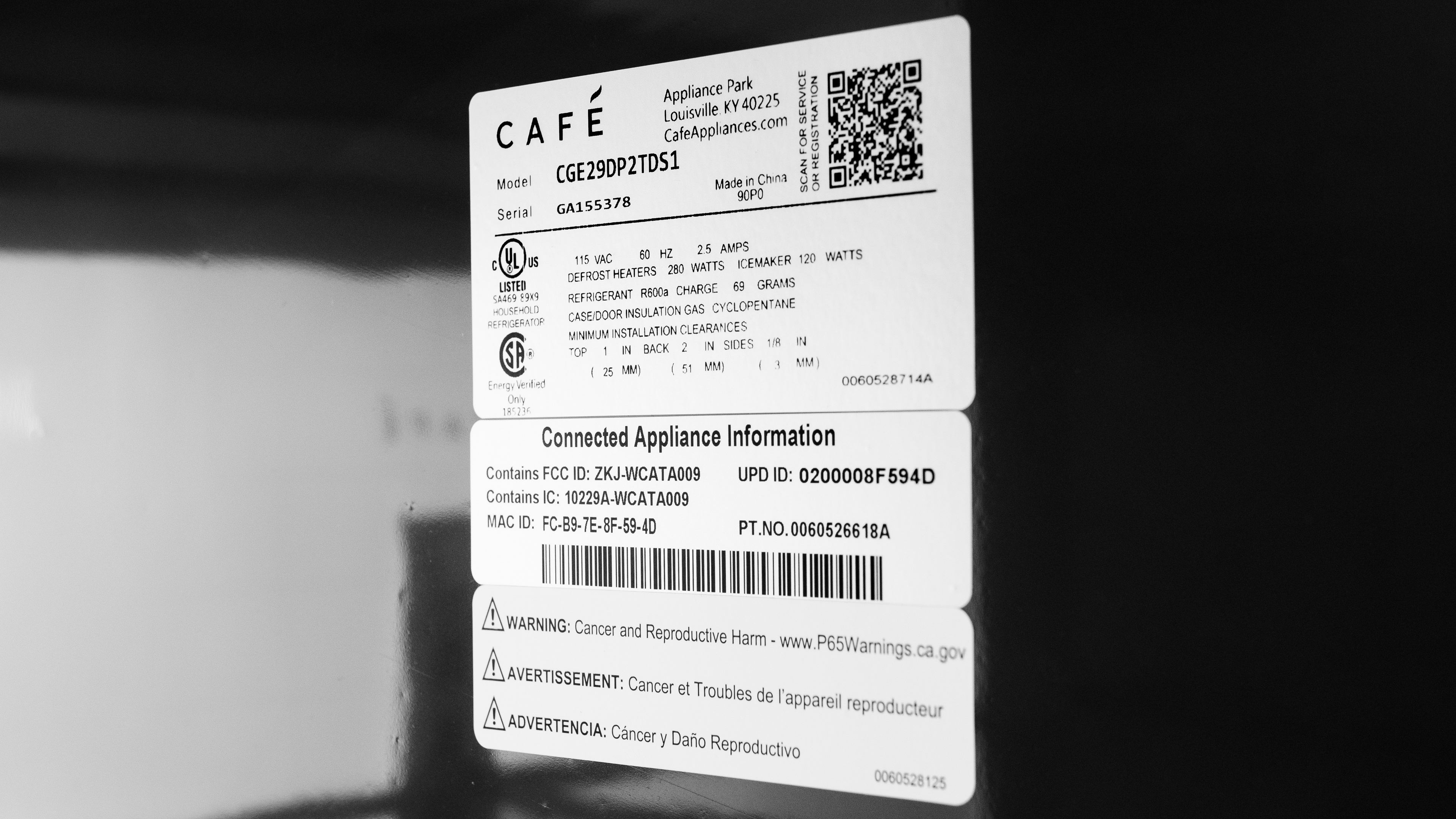 The Café CGE29DP2TS1 is available in five base finishes, with different door hardware finishes or no door handles. We tested the CGE29DP2TS1 model; here's its label. These refrigerators are also available with an external in-door water dispenser and in a counter-depth form factor. Our test results aren't representative of these variants.