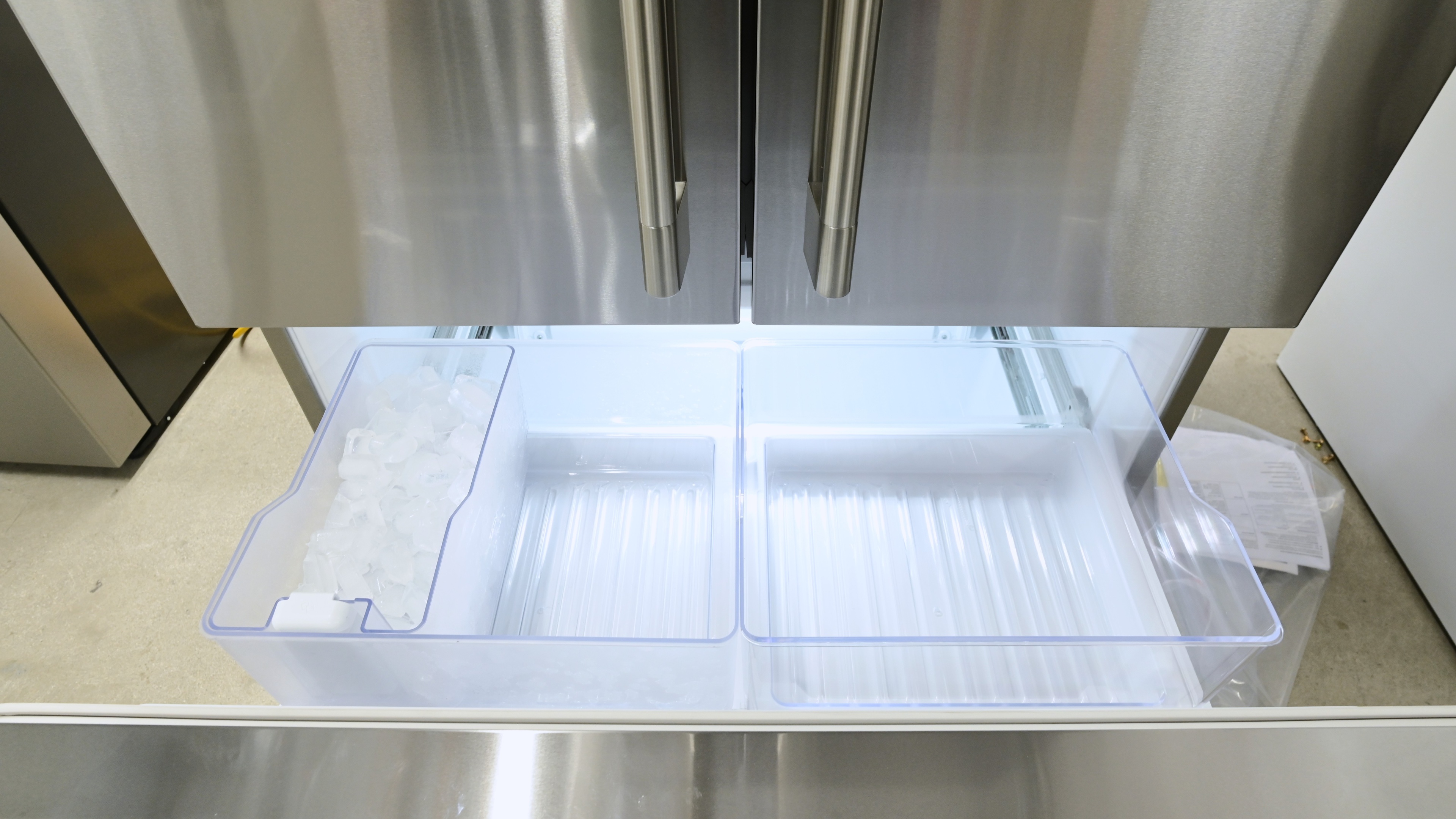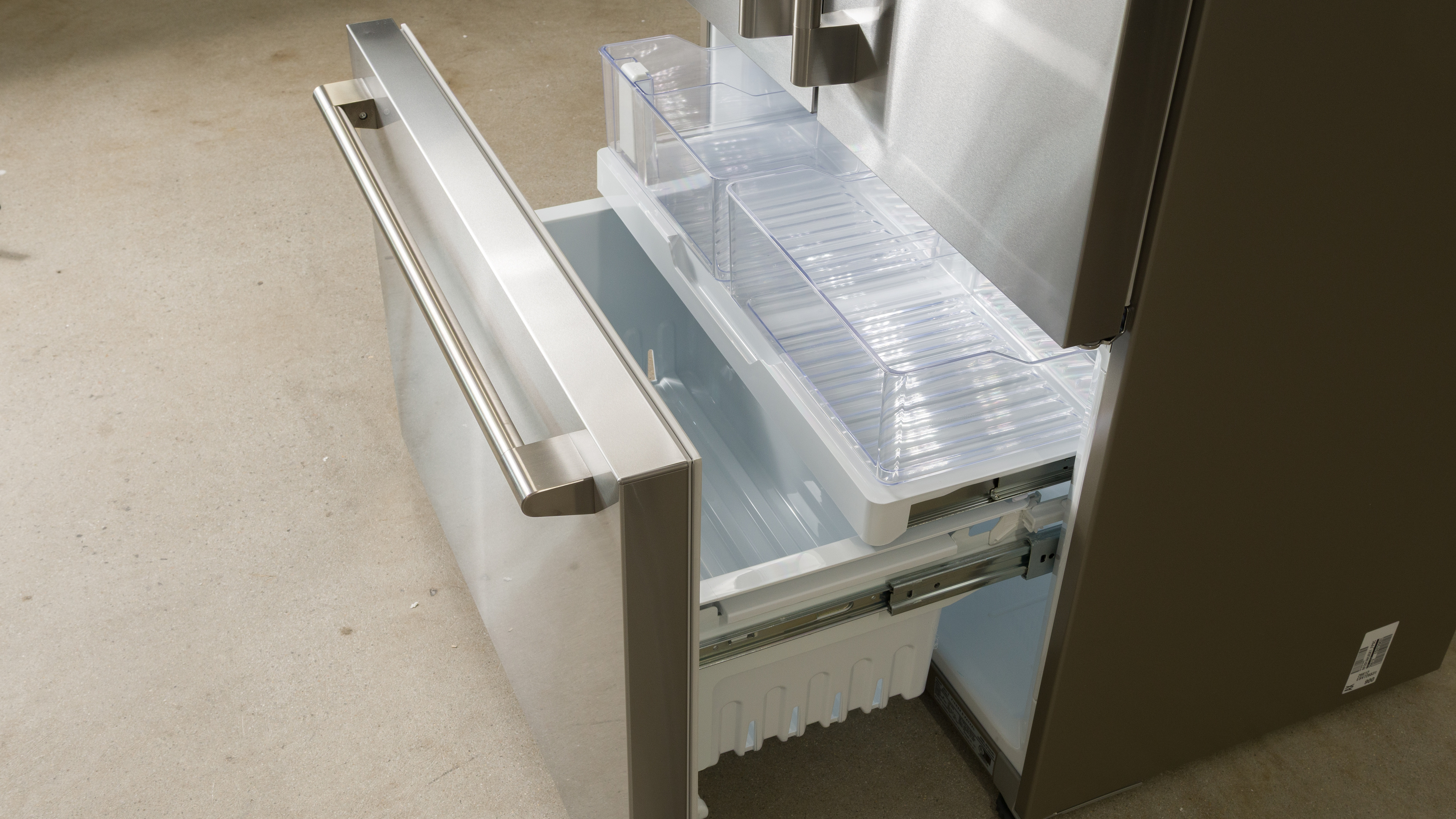 The freezer offers barely adequate capacity. The drawers are quite shallow. The bottom drawer is tall and wide enough to store a couple of family-sized boxes of burgers or chicken pieces, but it's not deep or tall enough to store large pizza boxes. The top drawer consists of a shelf that holds two removable bins. If you remove the bins, you can increase capacity by 0.045 cu ft (1.3 L), but you won't be able to prevent loose items like bags of frozen vegetables from falling off the sides of the shelf. Removing the ice tray from the left bin increases the total usable capacity to 3.2 cu ft (90.6 L).