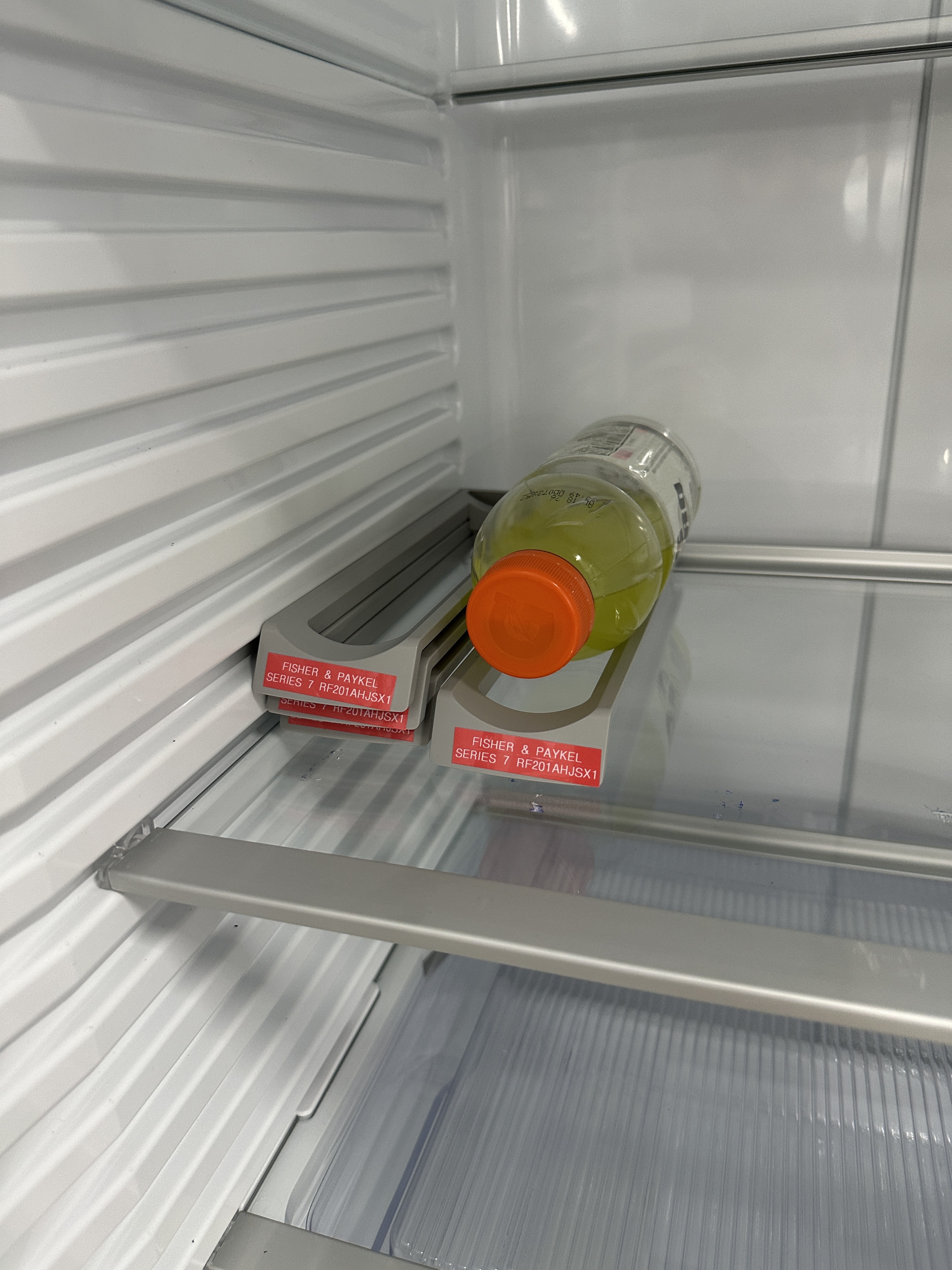 The Fisher & Paykel Series 7 RF201AHJSX1 provides decent refrigerator storage capacity, especially for a counter-depth fridge. Though the shelves aren't split, you can mount them in any of the 14 positions to provide a tall space for storing items like long-neck bottles. The two crisper drawers and two deli drawers underneath sit on pull-out shelves; you can remove the drawers for convenience. Removing the lower bins increases capacity by 0.195 cu ft (5.5 L), but removing the produce drawers doesn't add any capacity since the available vertical space doesn't increase due to the non-removable produce bin seal. This fridge also comes with four stackable bottle holders, which hold bottles horizontally, though you can't stack the bottle holders with bottles loaded in them.