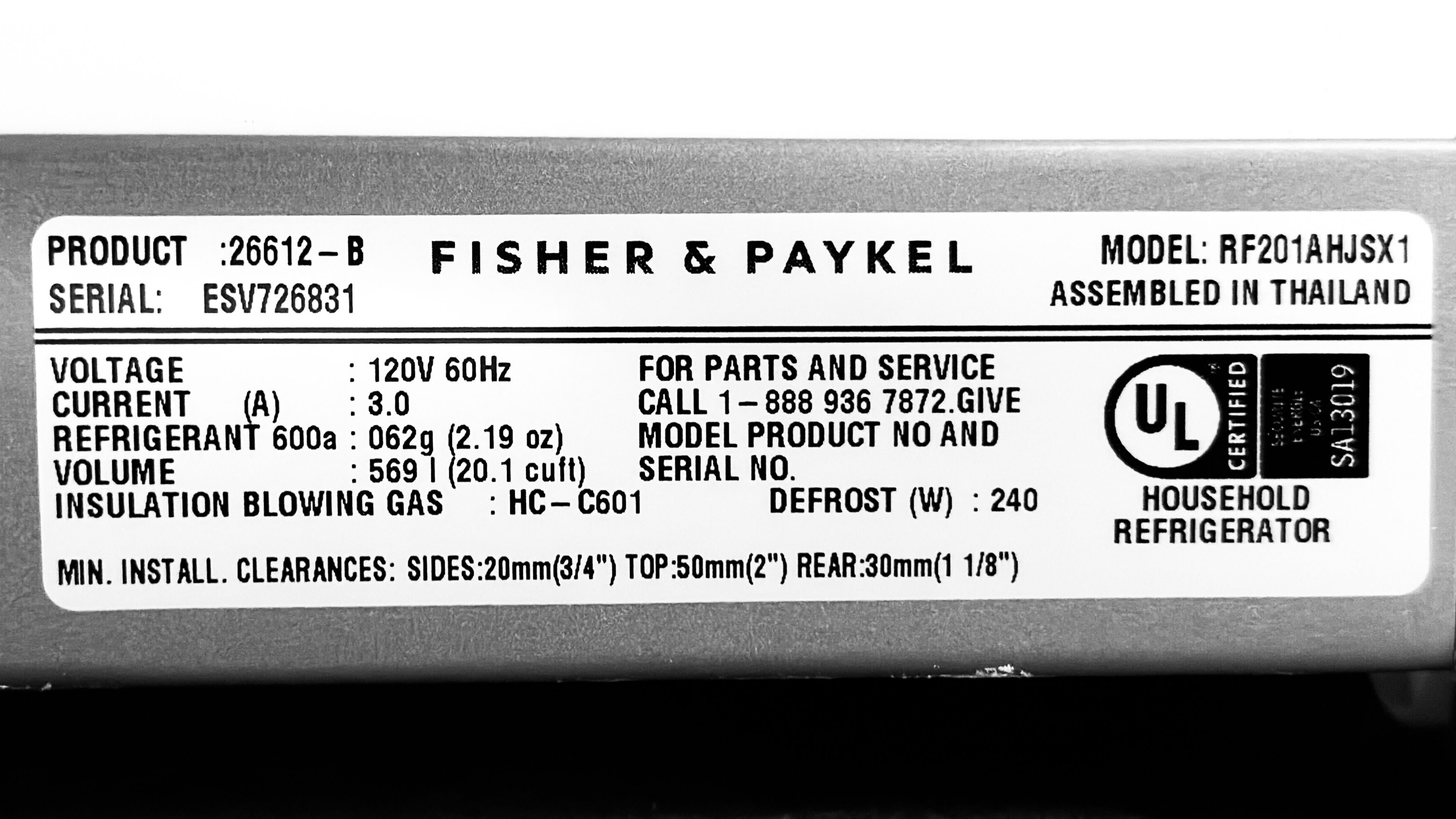 The Fisher & Paykel Series 7 RF201AHJSX1 comes in two variants: the Stainless Steel RF201AHJSX1 and the Stainless Steel RF201AHUSX1 model with a water and ice dispenser in the right fridge door. We tested the RF201AHJSX1; here's our unit's label. The water and ice dispenser in the RF201AHUSX1's refrigerator section will have a large impact on many of our tests, so our results shouldn't be taken as representative of this model.