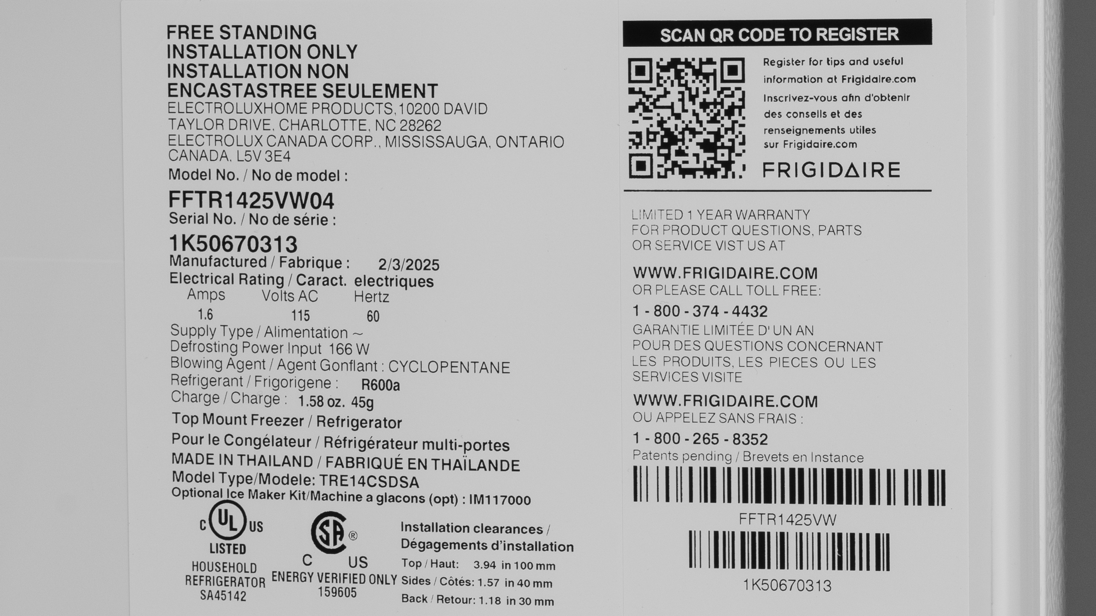 The Frigidaire FFTR1425VW is only available in one color: 'White'. For those interested, here's the product label for our test unit.