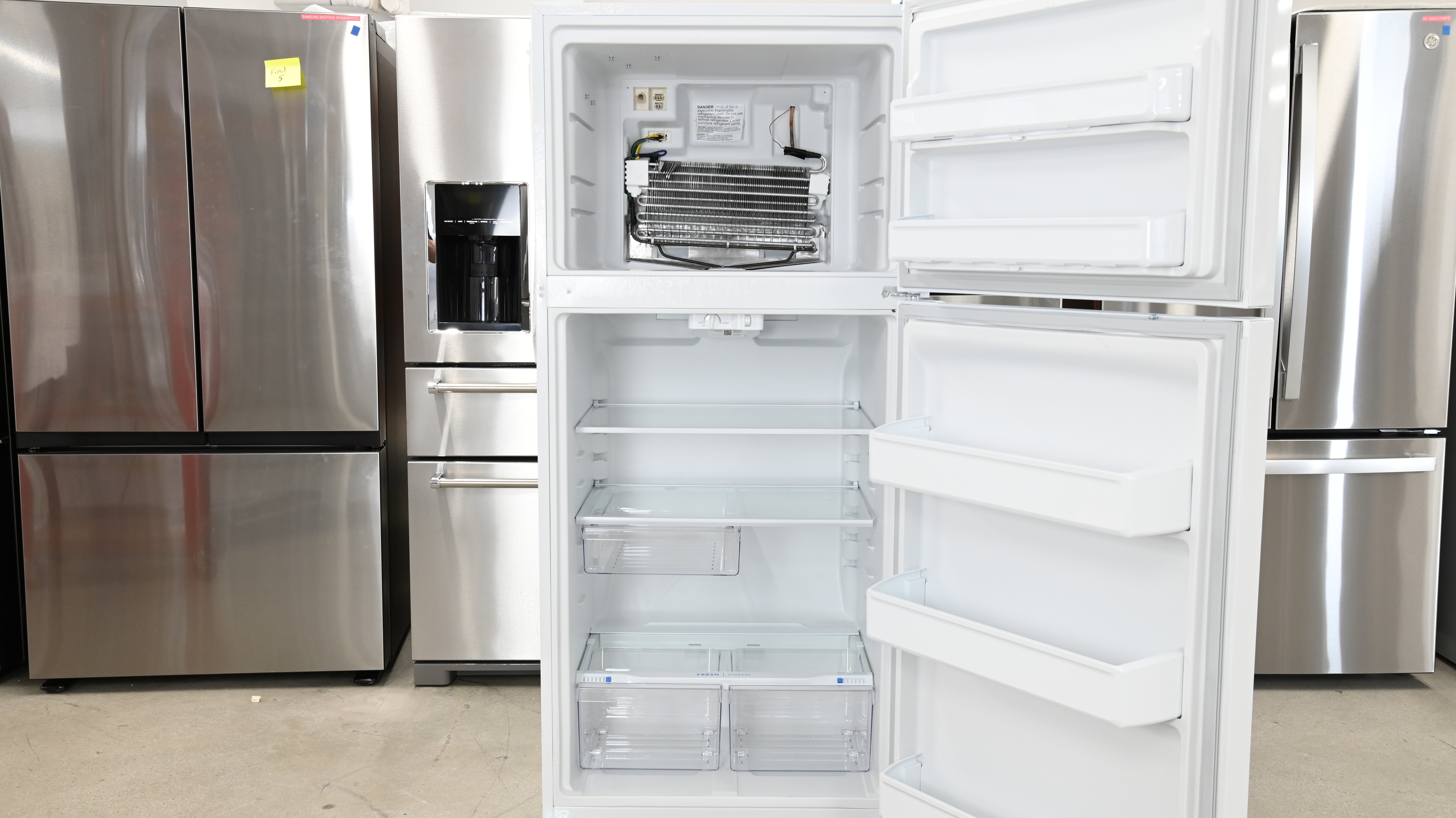The Frigidaire FFTR1835VW uses a single fixed-speed compressor, with an evaporator located in the freezer. This is a very simple, well-established design as far as cooling systems are concerned. While this doesn't necessarily mean that the fridge will be completely bulletproof from a reliability perspective, it does mean there are fewer obvious failure points compared to a higher-end unit that would use an inverter compressor and separate evaporators for the fridge and freezer compartments. There are some inevitable trade-offs with this kind of simplicity: a fixed-speed compressor like this one won't operate as efficiently, and consequently as cheaply, as an inverter-controlled unit, which is able to modulate its speed based on cooling requirements.