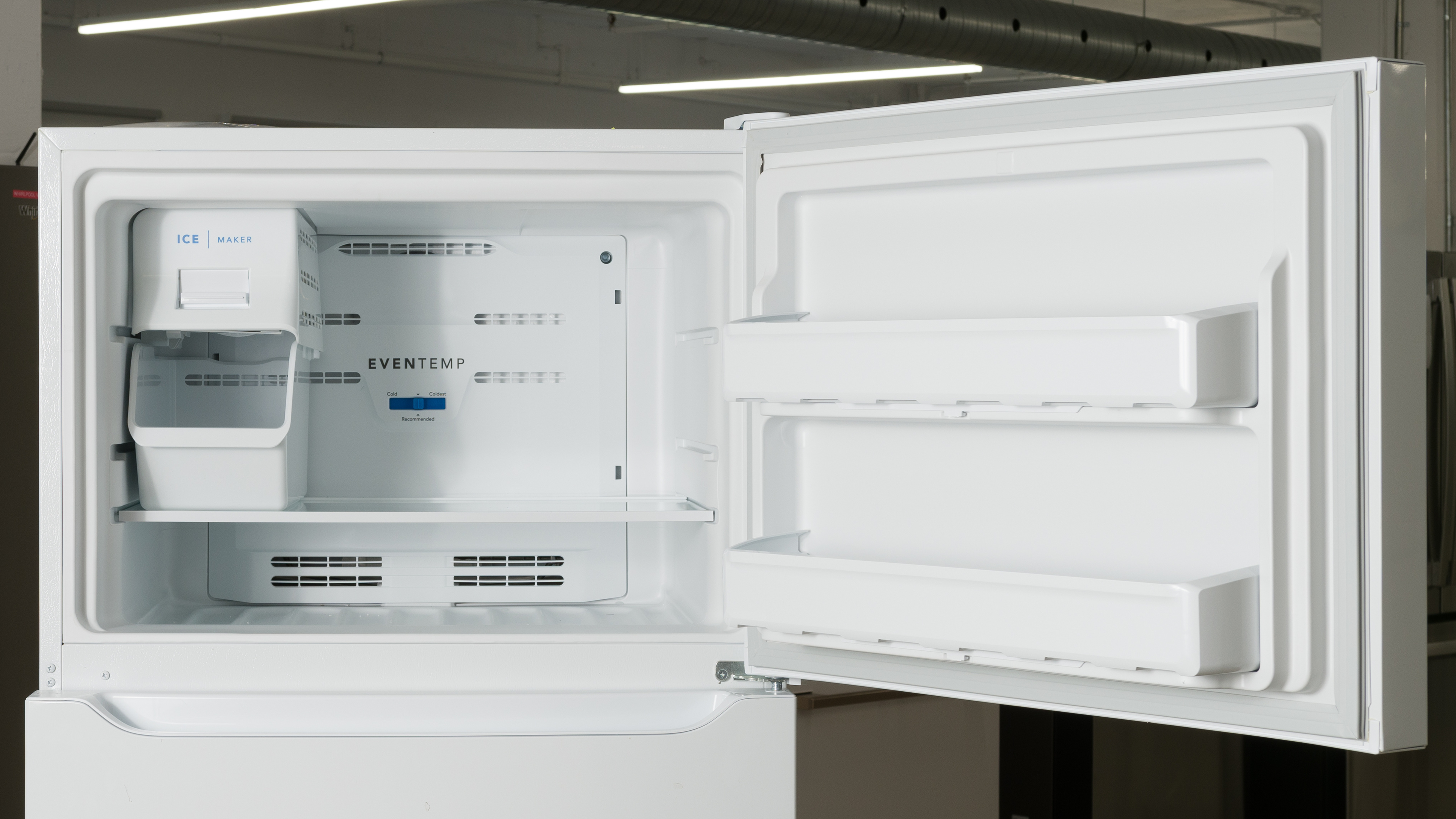 The Frigidaire FFTR1835VW is a decent option for storing frozen food. Its freezer compartment doesn't offer showstopping capacity, but it's laid out practically and has few obvious protrusions or bump-outs that really cut into the usable volume when squeezing in larger boxed items. If you really need more space, not purchasing the optional ice maker nets you roughly 15% more usable space.