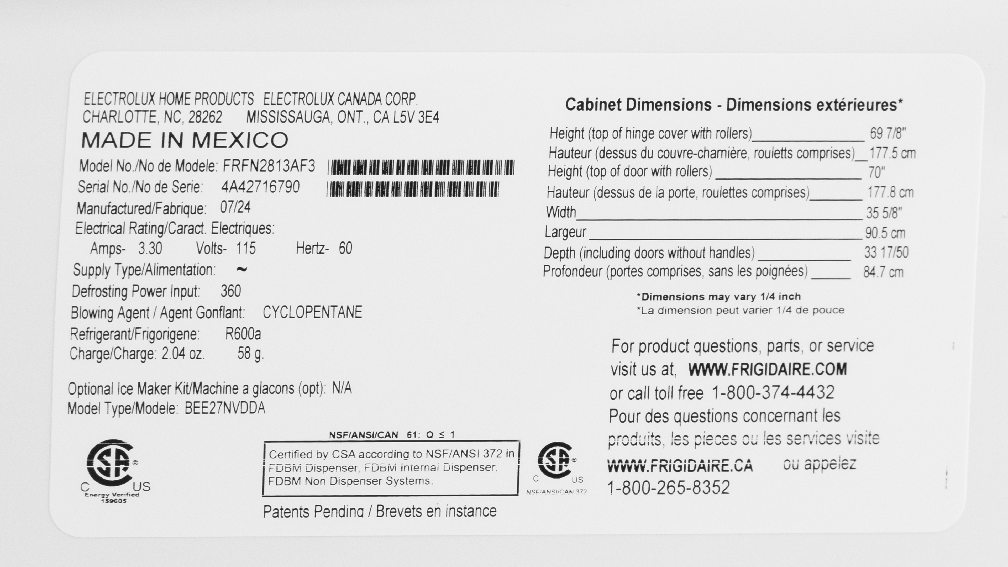 This fridge is only available as a single variant: FRFN2813AF, with a stainless steel finish. For those interested, here's the product label for the model we bought and tested.