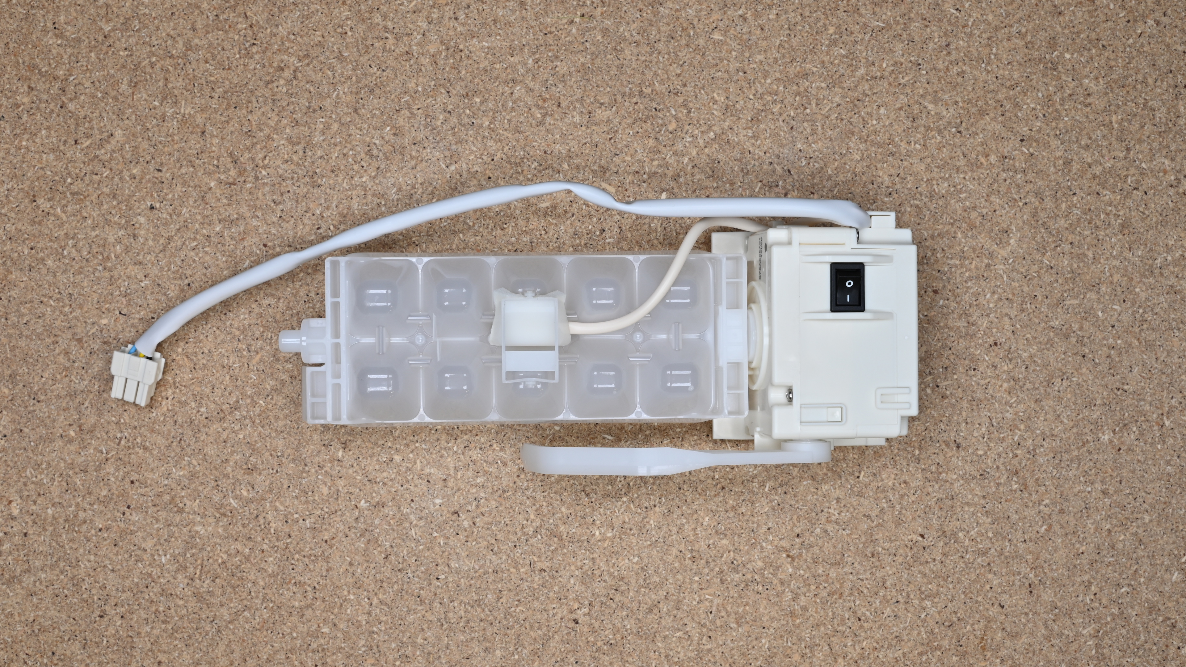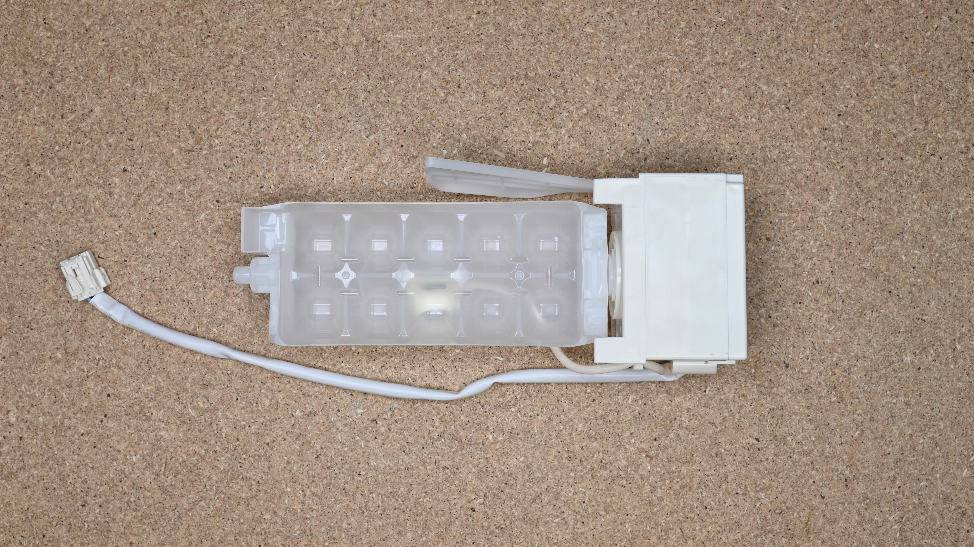 This unit has a twist-tray style ice maker. These systems work in a fairly simple fashion: water freezes inside a plastic mold, which a motor twists to deform the mold and pop the ice out into a tray. However, the flexible plastic mold can become brittle from regular thermal cycling and mechanical stress, and can eventually crack.