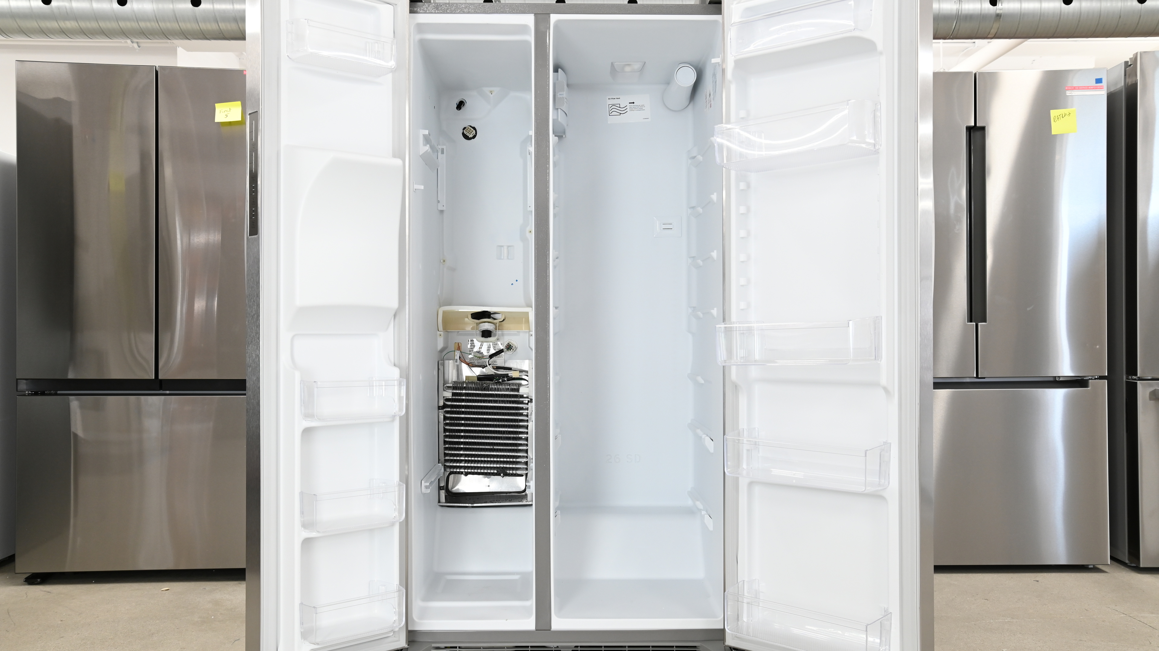 The Frigidaire FRSS2623AS uses an inverter-controlled compressor and a single evaporator in its freezer, a very standard arrangement for a fridge in this price bracket. On paper, an inverter compressor like this one will consume less energy than a fixed-speed compressor, as the former can adjust its speed to match the required cooling load instead of cycling on and off constantly to maintain a setpoint. That said, inverter compressors do introduce a layer of complexity in the form of a control board and introduce a potentially costly failure point.