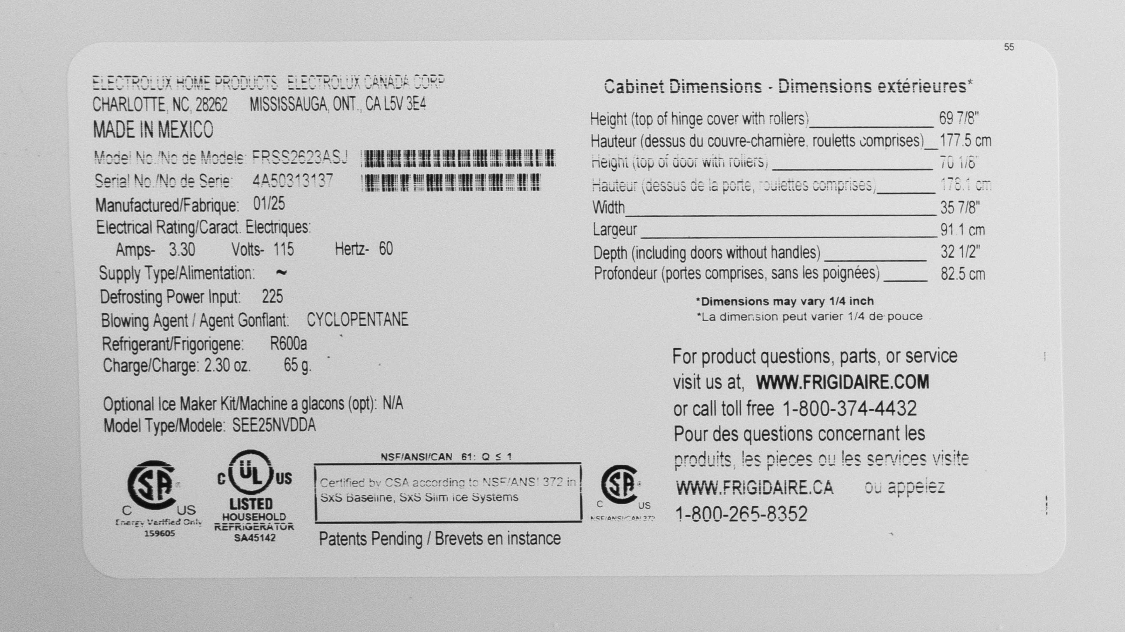 We tested the Stainless Steel (FRSS2623AS) version, and for those interested, here's the product label.