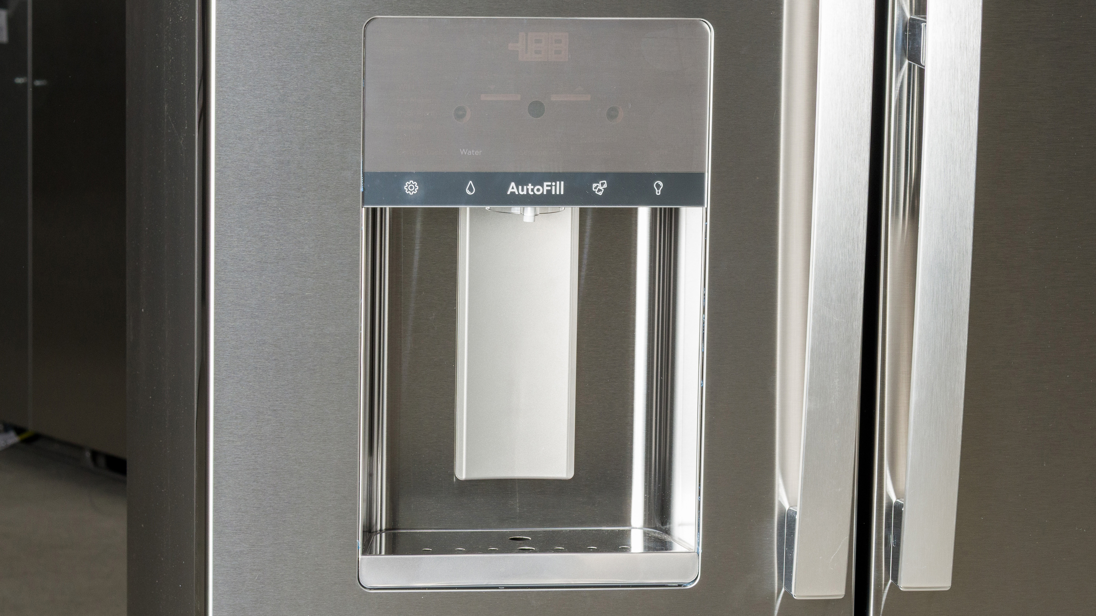 There's an ice and water dispenser on the left door. It has a proximity-activated LED light, so it will light up as soon as anyone approaches it. Using the control panel, you can select ice cubes, crushed ice, or water, manually activate the light, and check the filter status. The system is hands-free and automatically fills a glass you place below the nozzle, stopping the water flow before it overfills.