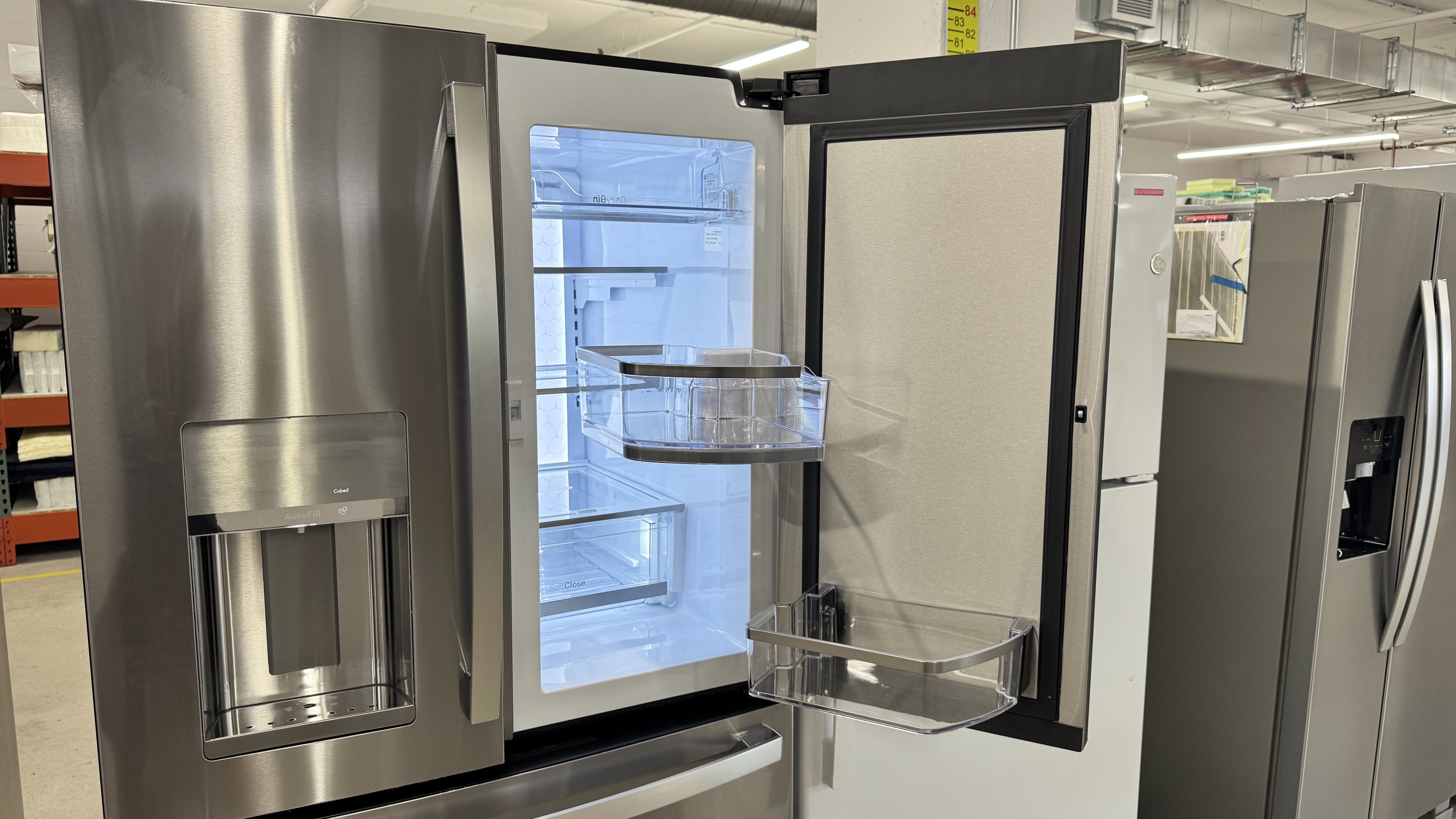 The GE Profile PVD28BYNFS offers very good storage capacity in the refrigerator. Many clever, flexible features allow you to make good use of the space and store tall or large items like bottles in multiple locations. There are unusually deep door bins in the door-in-door in the fridge, accessible from both sides, and a height-adjustable bin that swivels in or out. The fridge has two split shelves that you can adjust to various heights. The middle pull-out drawer offers a storage area where you can set the temperature separately from the rest of the refrigerator.