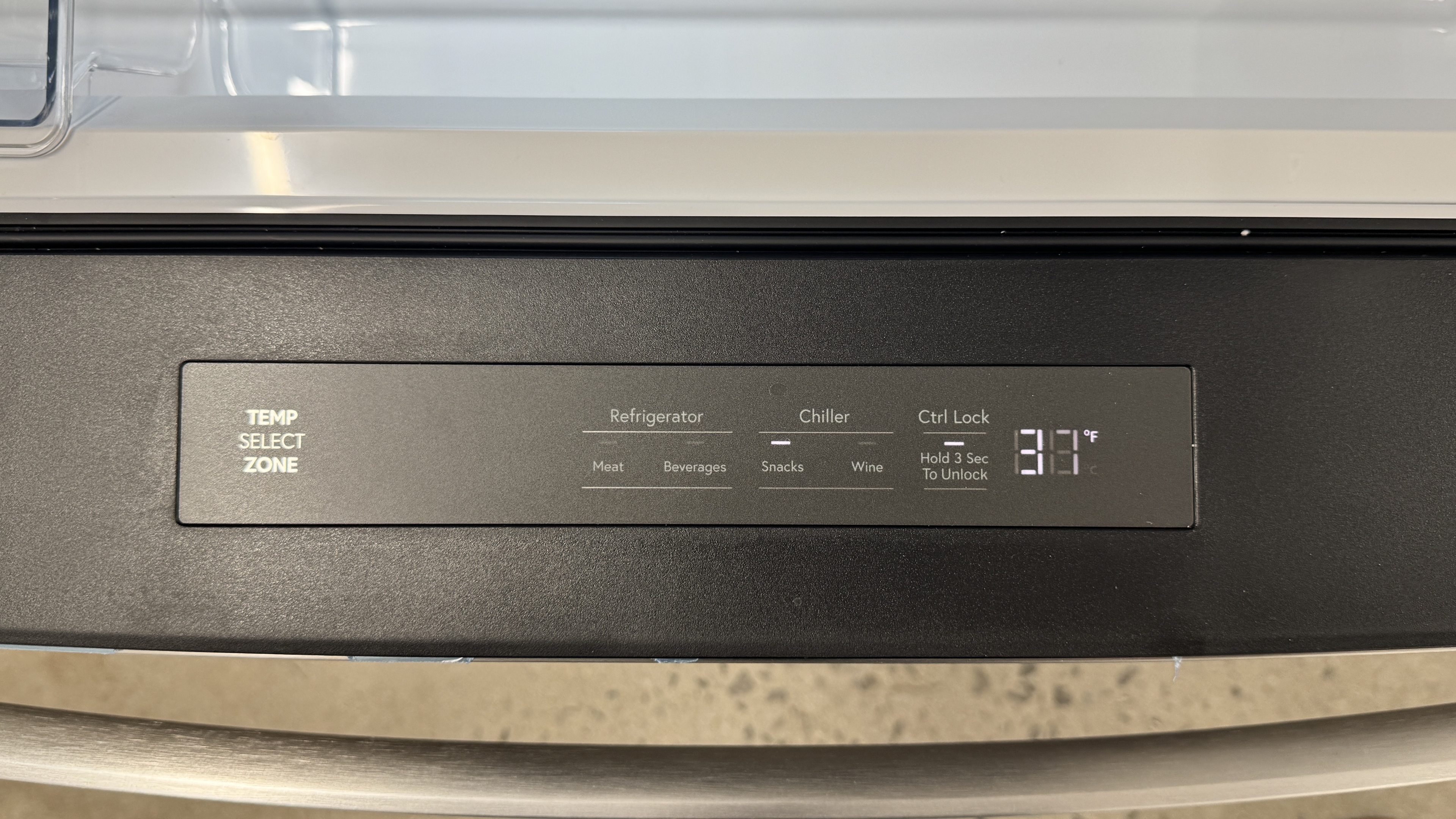 The separate temperature-controlled drawer sits between the fridge and freezer and has a capacity of 3.61 cu. ft. (102.2 L). It has a beverage tray with can holder grooves that you can slide horizontally to accommodate taller items in the drawer. You can control the temperature in this drawer using the control panel on top of the drawer door, setting it for Meat (29 °F), Beverages (33 °F), Snacks (37 °F), or Wine (42 °F).