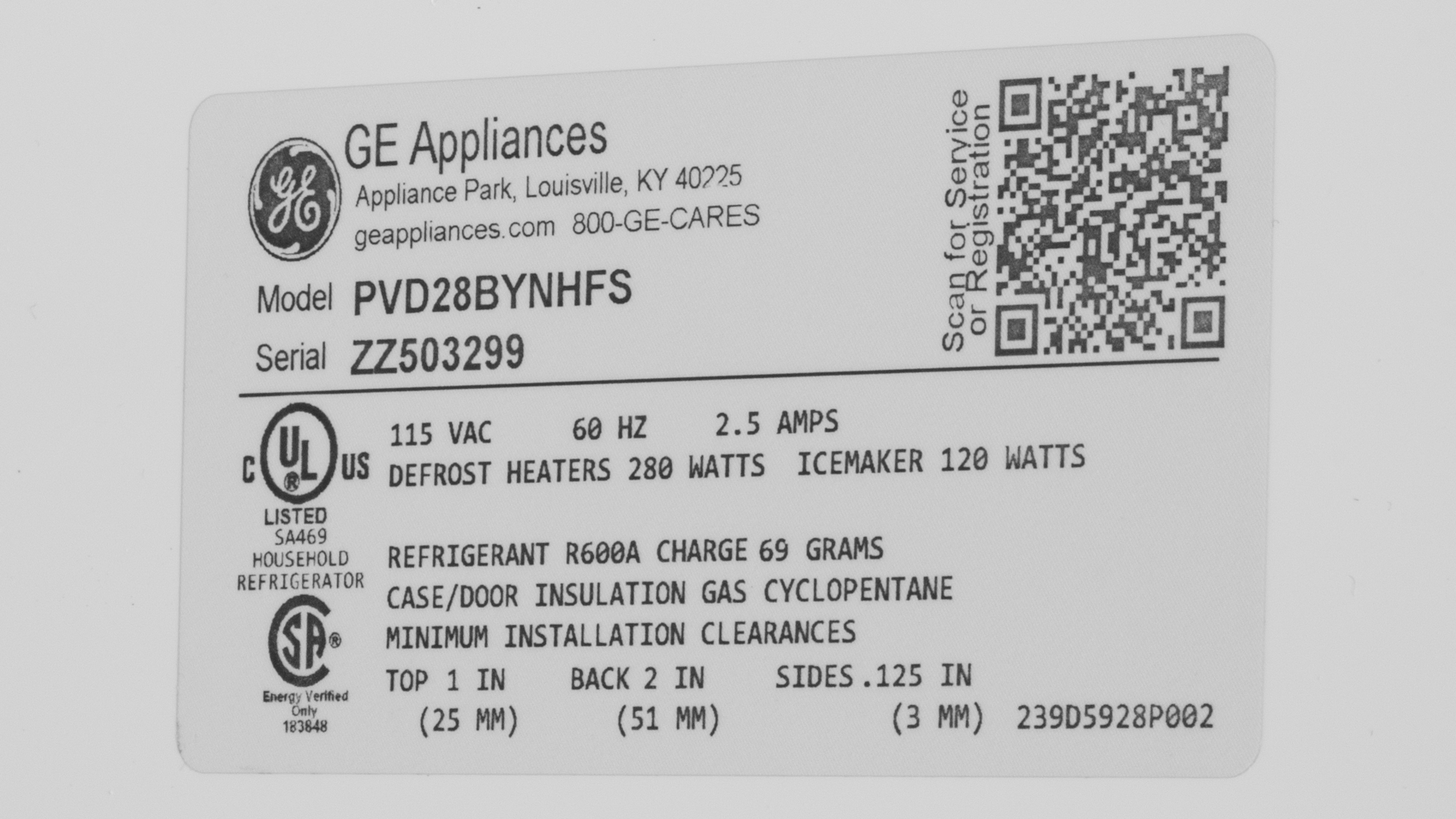There's only one variant of the General Electric Profile PVD28BYNFS, and it's available in stainless steel. Here's a photo of the label for our test unit.