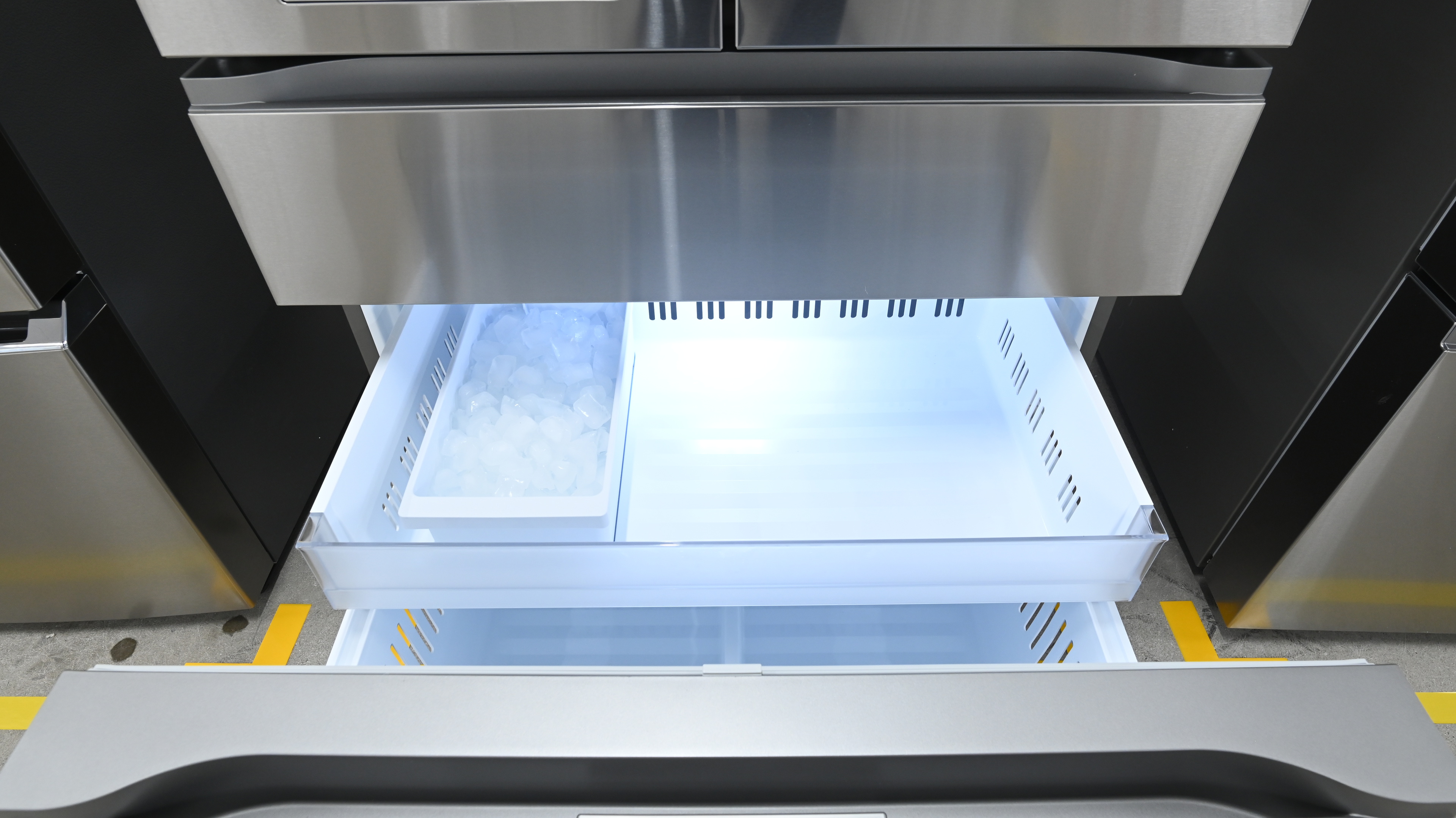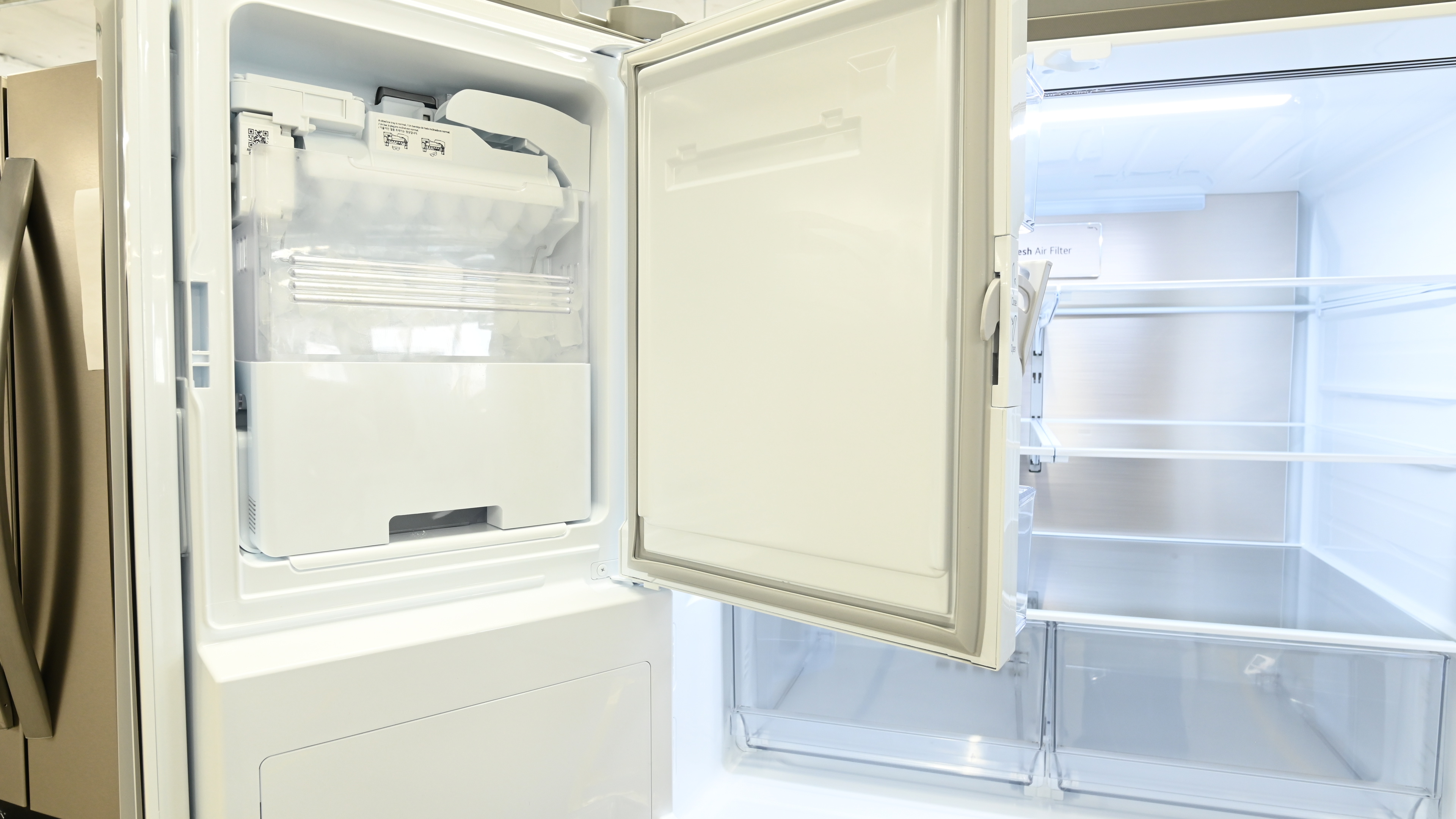 This fridge has a pair of twist-tray ice makers: the Slim SpacePlus Ice System is built into the fridge door, and the other is in the freezer. Of the two, it's more likely that the in-fridge system will experience some sort of issue first. This design requires additional insulation and ducts, not to mention running water lines through the door, all of which introduce a high number of potential failure points.