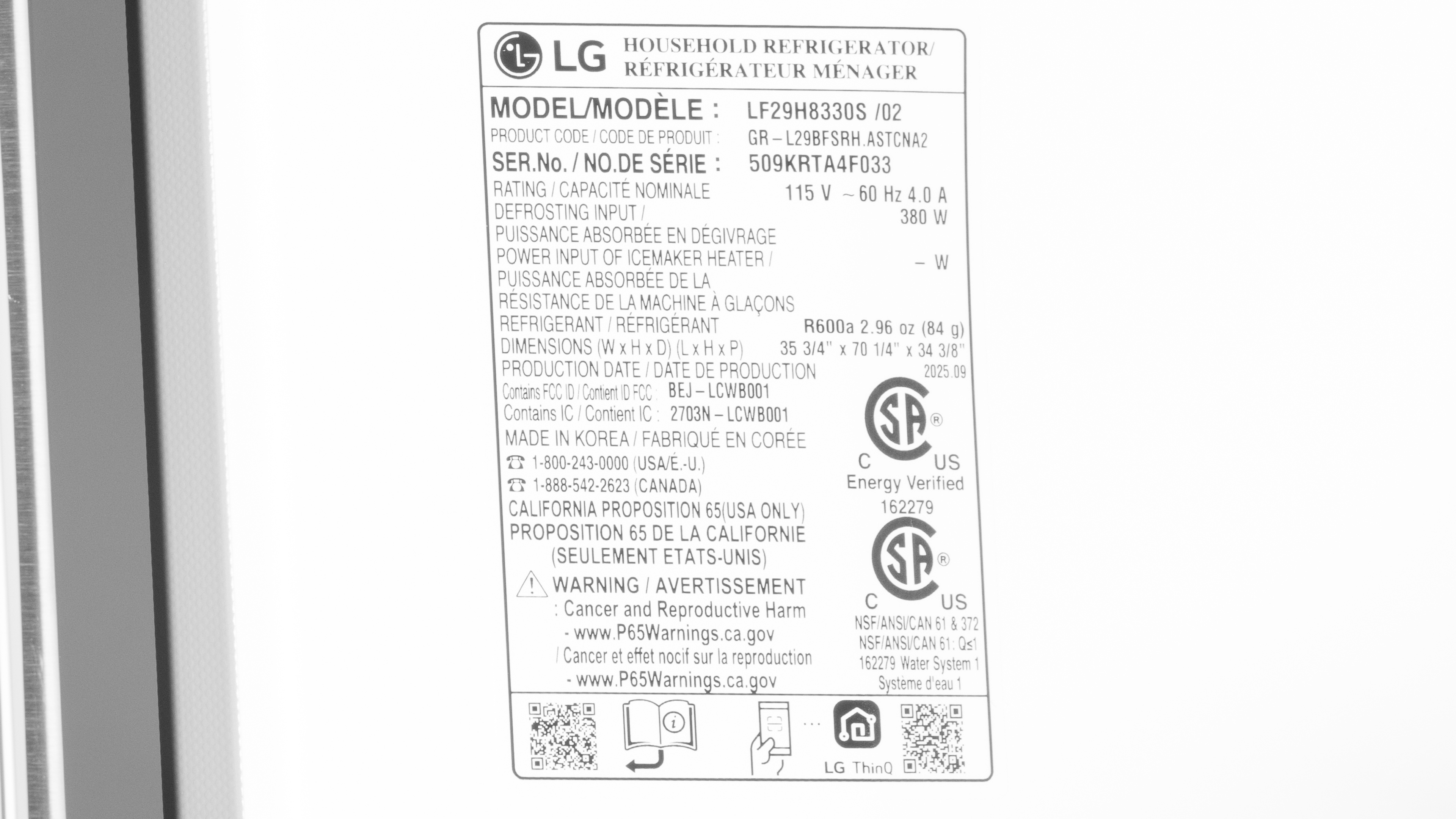 We bought and tested the LF29H8330S model, finished in stainless steel, and for those interested, here's a photo of our test unit's product label. If you come across another variant of this refrigerator, let us know in the comments below so that we can update our review.