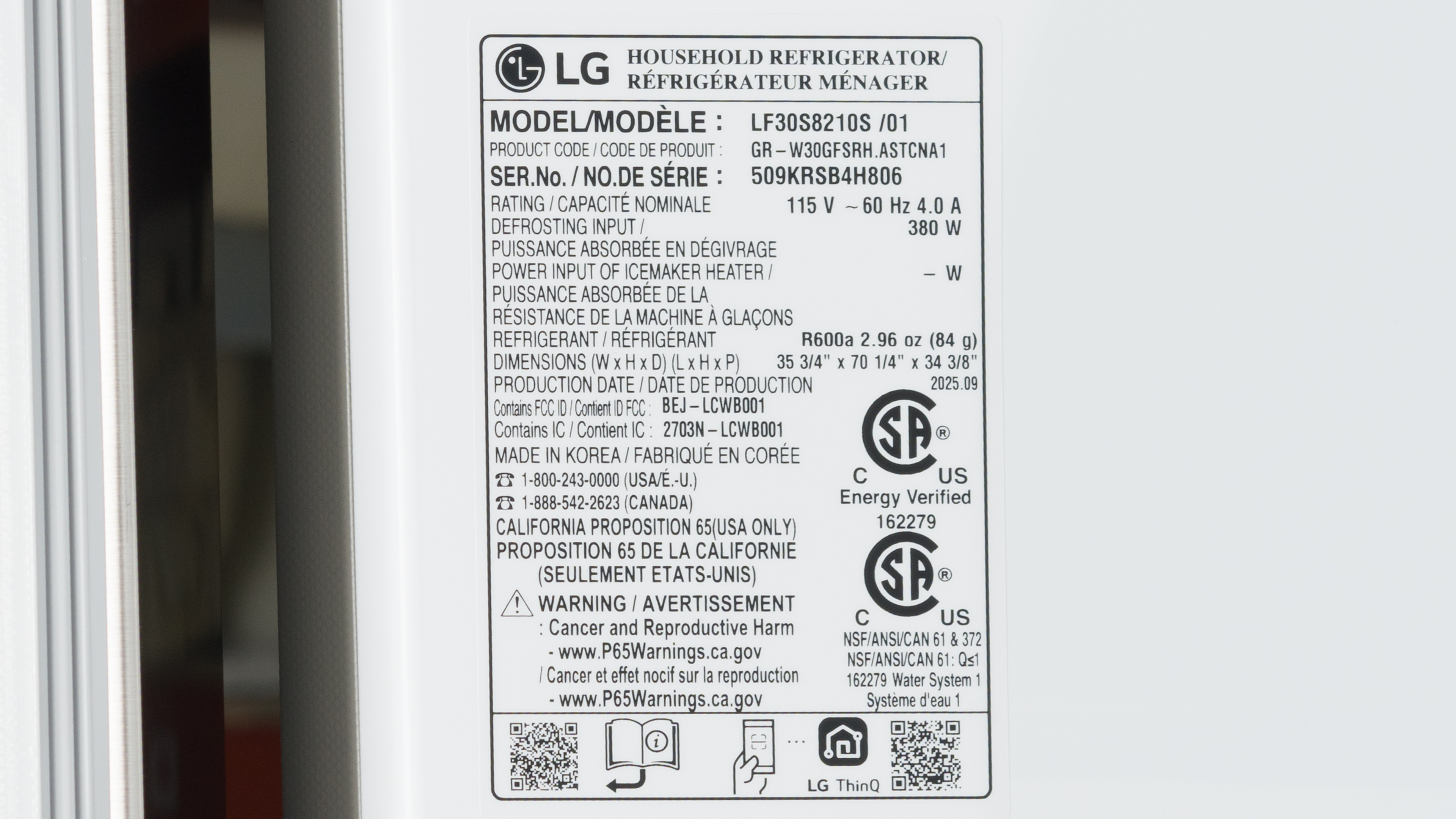 The LG LF30S8210S is only available in a stainless steel finish. For those interested, here's the product label for the unit we bought and tested. If you come across another variant of this refrigerator, let us know in the comments below so that we can update our review.