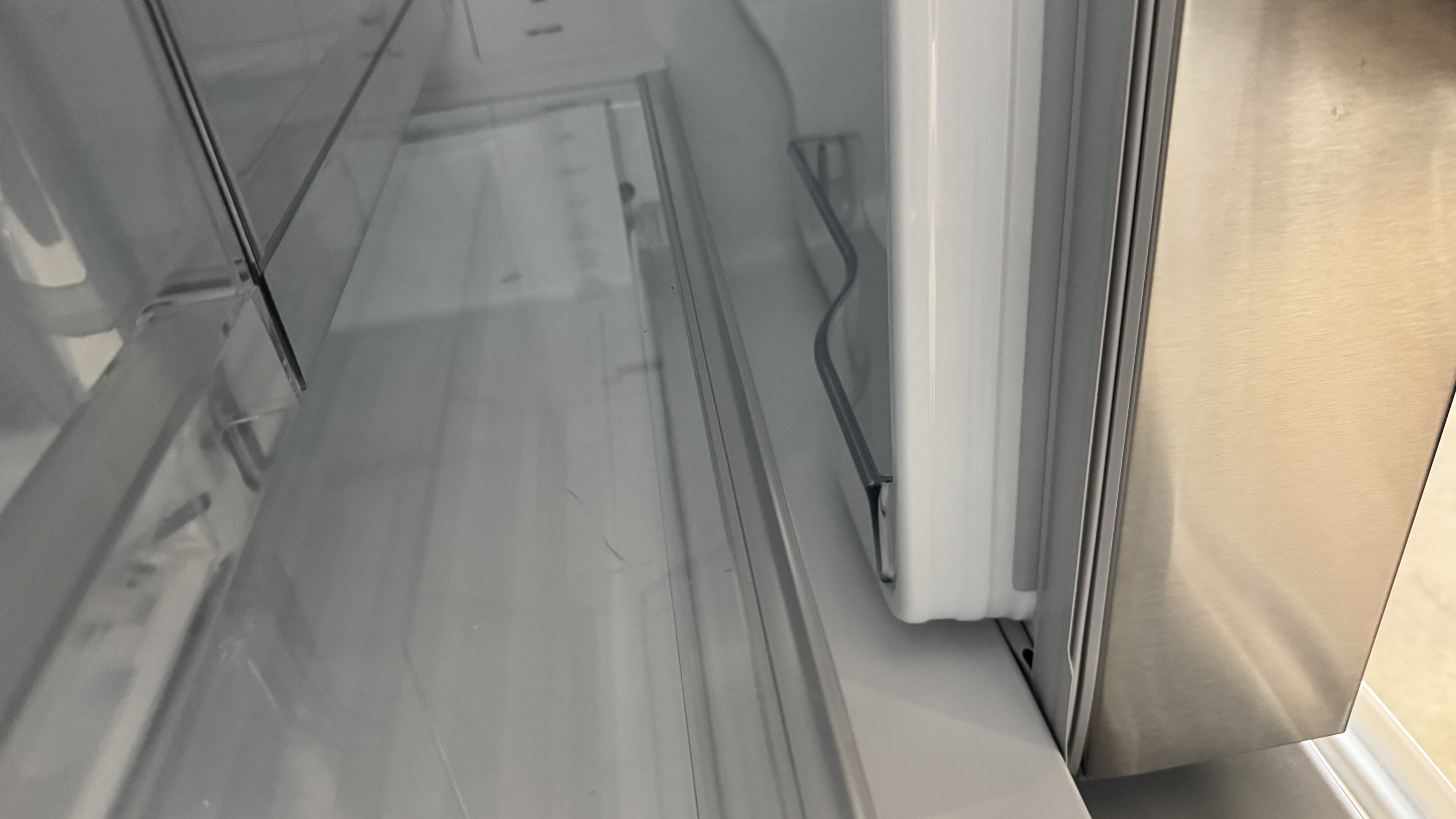 The only hardware that limits capacity is the water filter cover at the top left of the fridge. It allows easy access to the filter but limits the height of items underneath, requiring you to move the split shelf down.