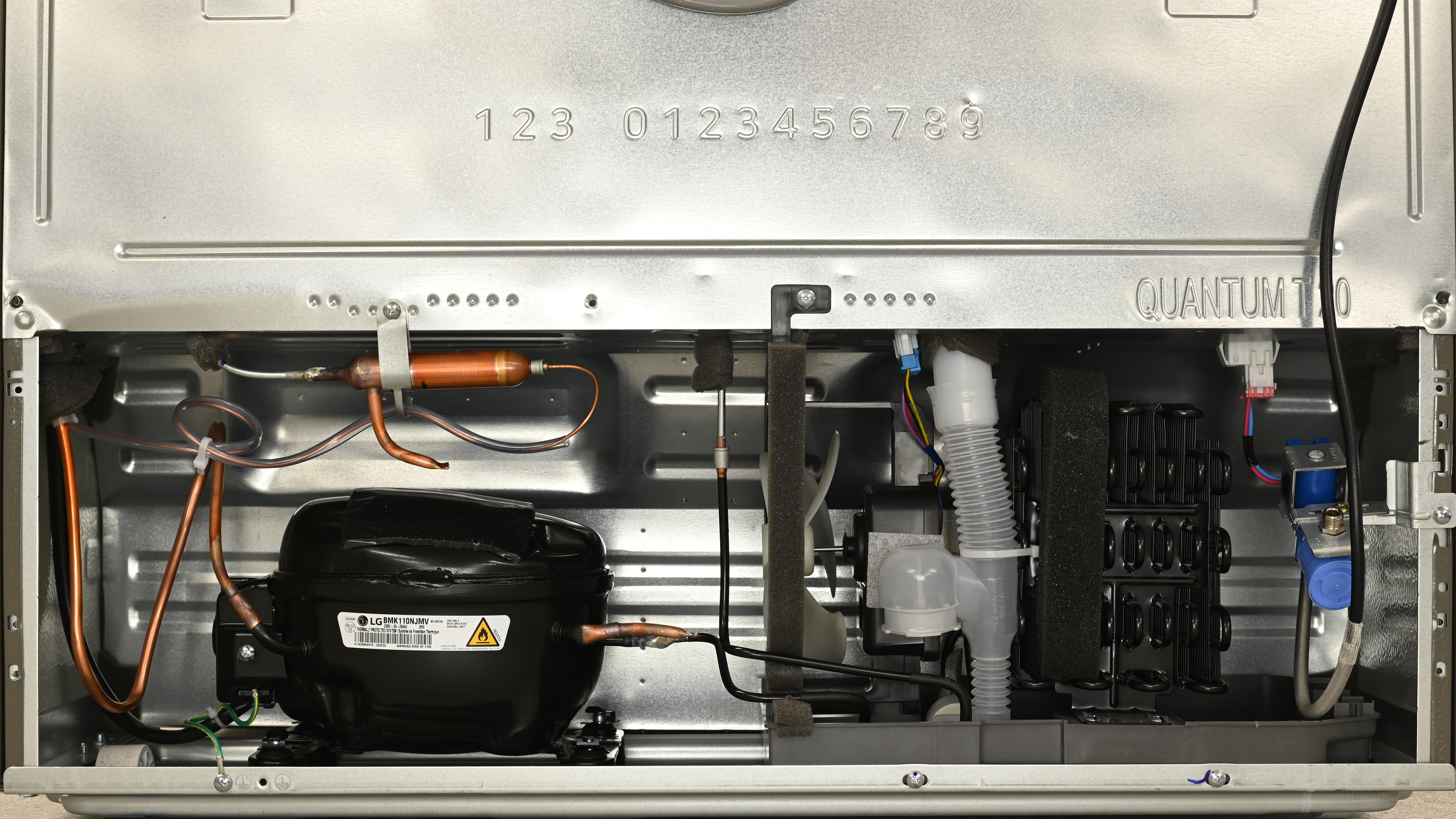 The cooling system in this refrigerator consists of a single evaporator and a single inverter compressor. Single evaporators and single compressors are the norm for budget units like this fridge, but an inverter compressor is an upgrade from older fixed-speed compressors. An inverter-powered compressor can vary its speed based on load. It saves power and can lead to better temperature control. Unfortunately, this scheme adds an inverter controller board loaded with electronic components, creating an additional failure point.
