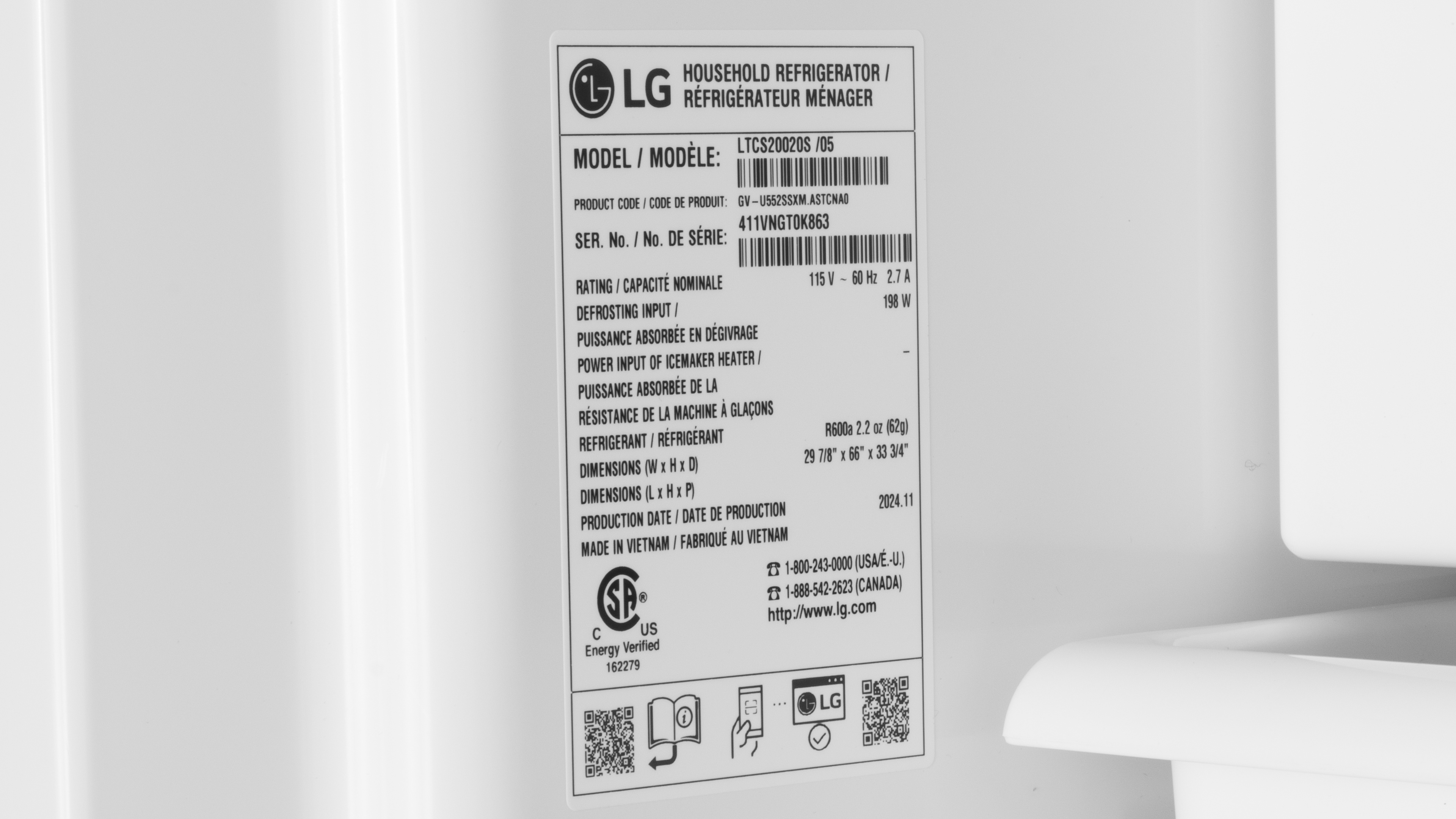 There are several variants of the LG LTCS20020. They only differ by color or surface finish. We tested the stainless steel LTCS20020S; here's its product label.