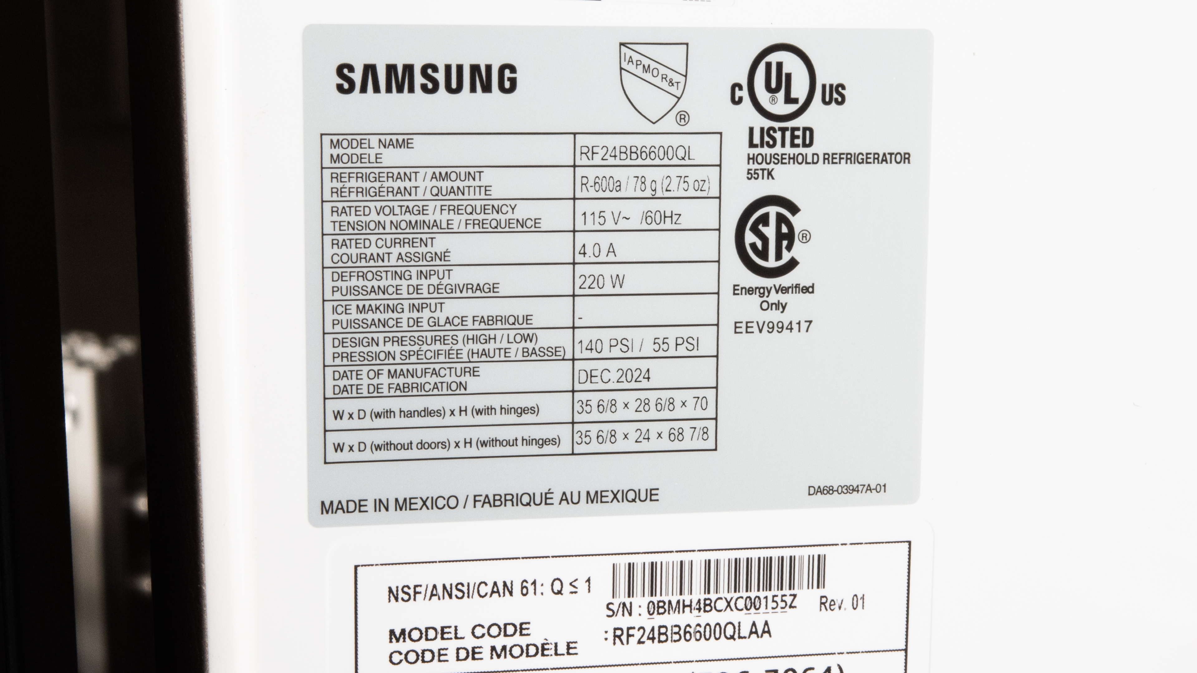 Our test unit is the RF24BB6600QLAA, a counter-depth 3-door French-door model with Samsung's 'Beverage Center' feature, in a Stainless Steel exterior finish. For those interested, here's the product label.