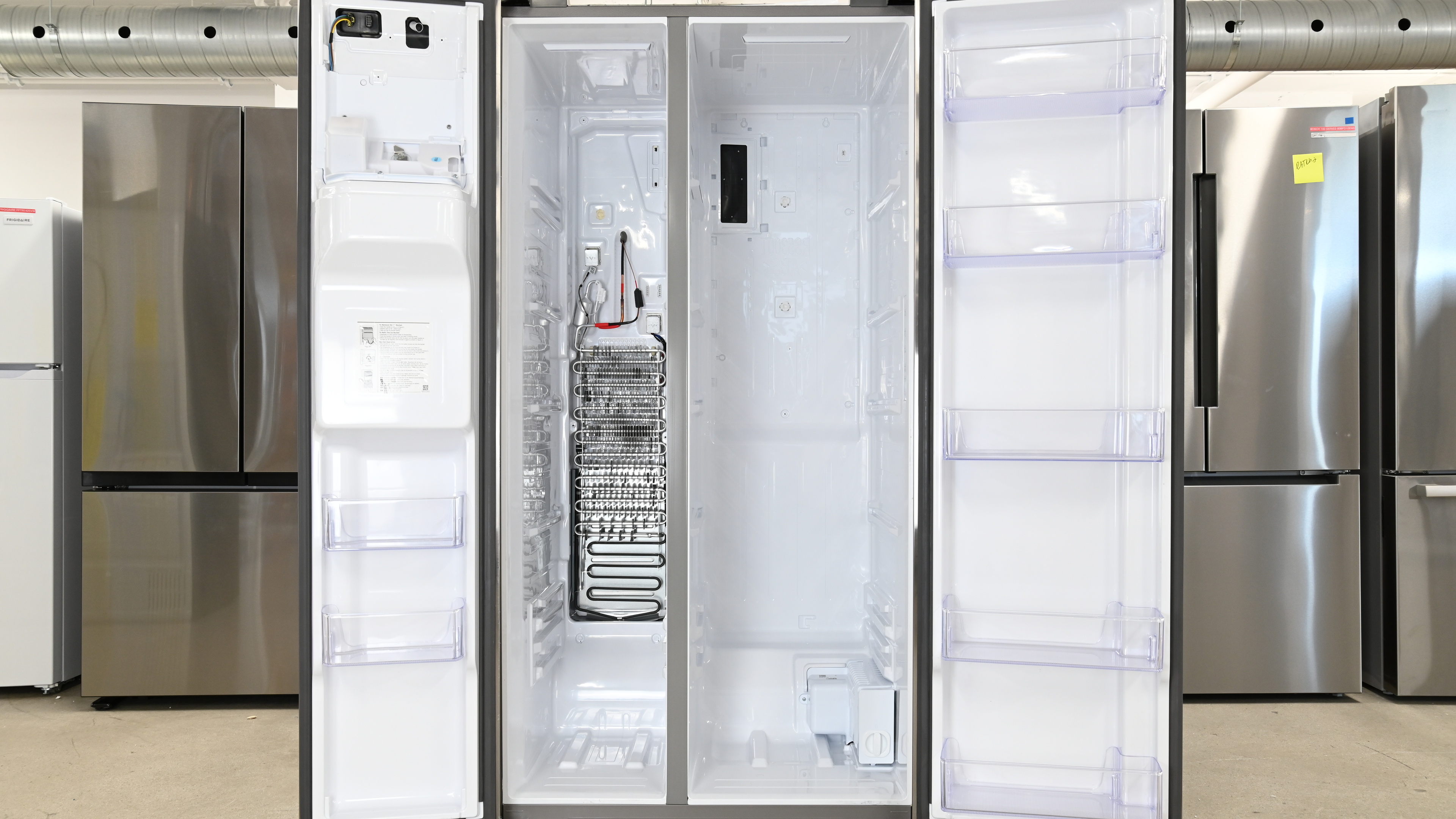 The Samsung RS27T5200SR is a midrange side-by-side standard-depth 36-inch refrigerator. Its cooling system is relatively conventional for a unit in this price bracket, with an inverter-controlled compressor and an in-freezer evaporator. As far as features go, there's a combination filtered water and ice dispenser in the freezer door, as well as a low-profile in-door ice bucket.
