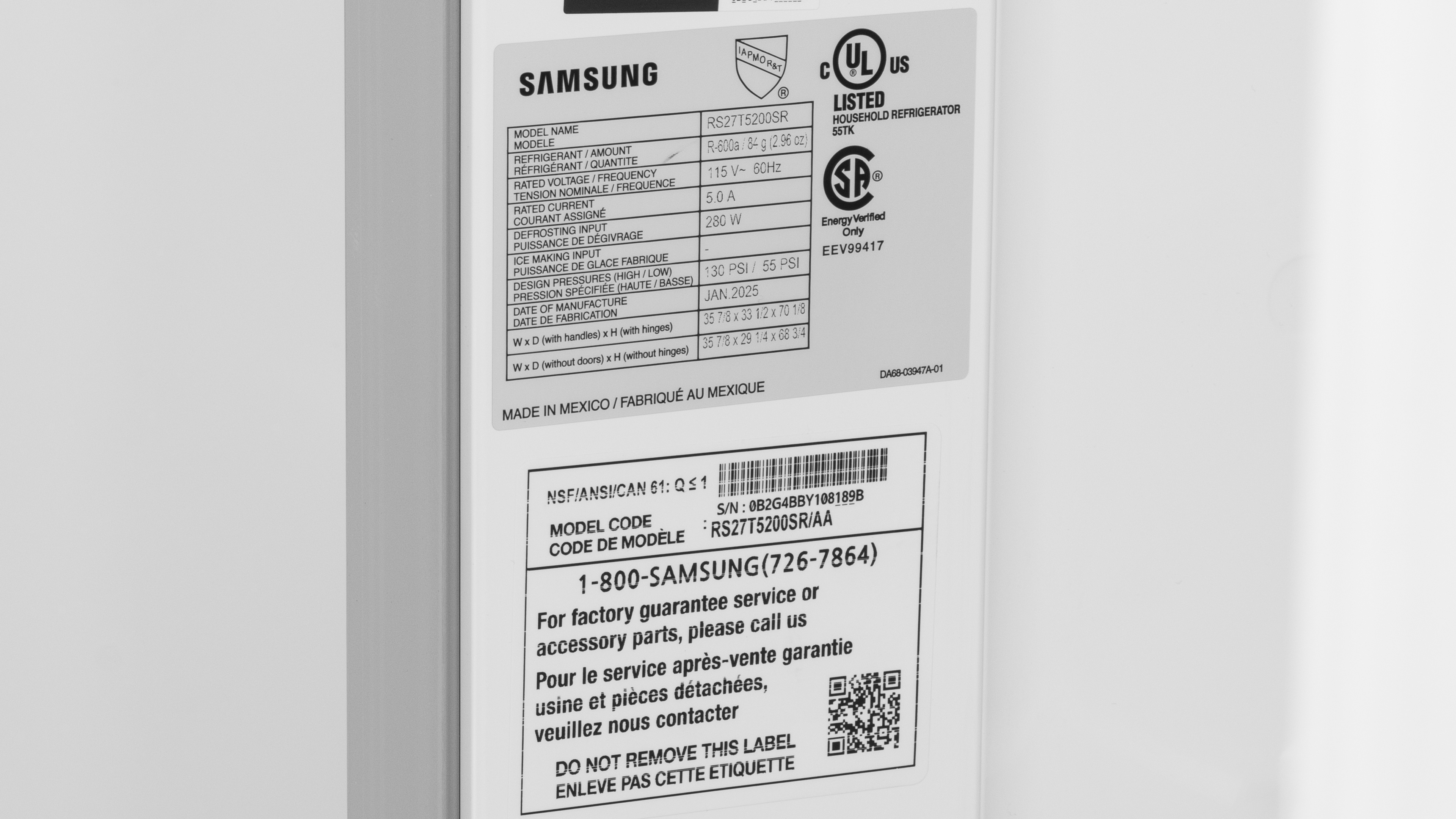 We tested the RS27T5200SR model in Stainless Steel, and for those interested, here's the product label.