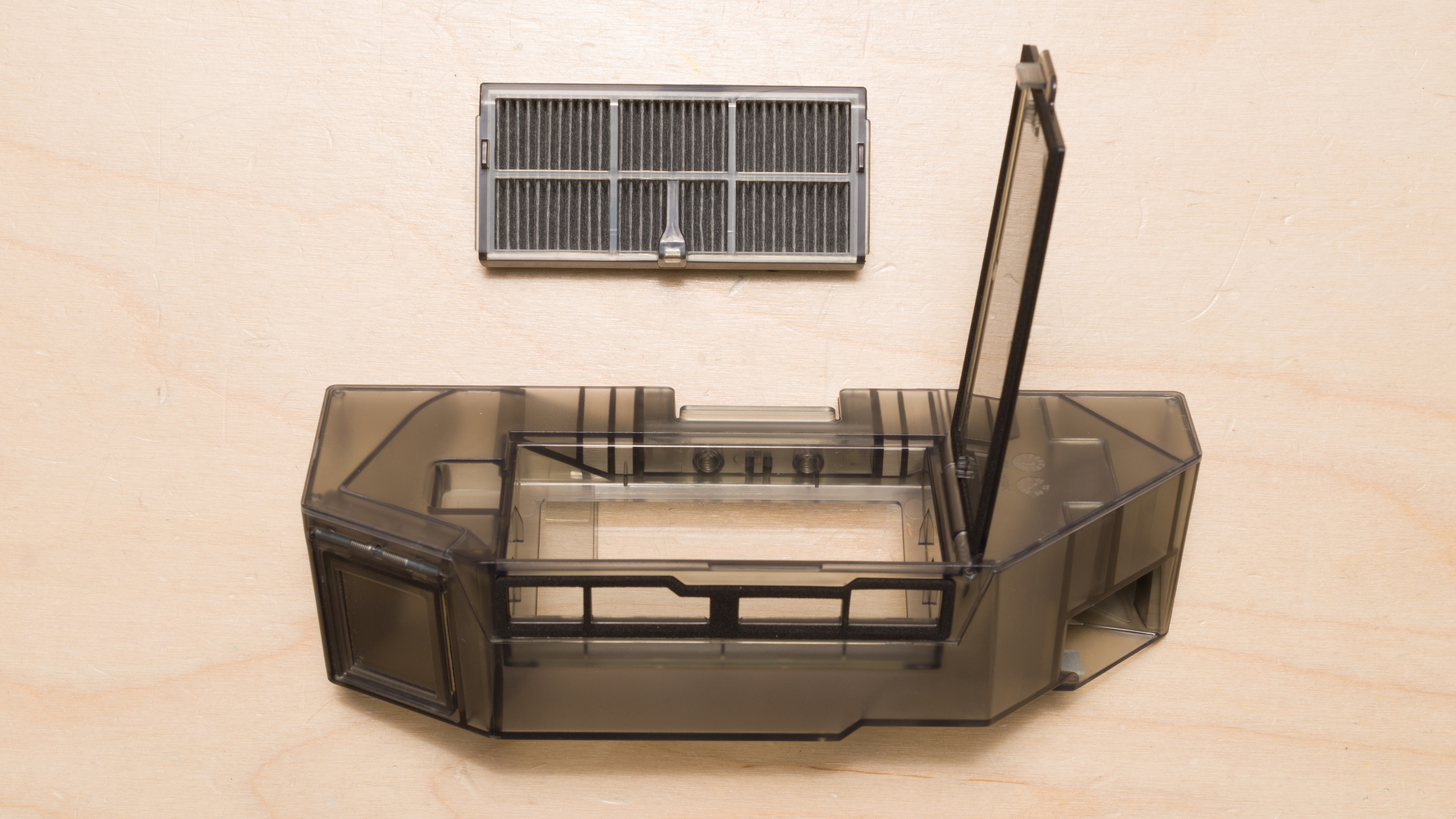 This robot vacuum has many parts that require regular cleaning and maintenance, but most parts are easy to access. The brushroll does get tangled with hair, though it's very simple to remove and clean. If hair tangling becomes a problem, you can replace the default brushroll and purchase an anti-tangling brushroll that cuts tangled hair as it rotates. All other parts are easy to remove and service, with only the side brush and omnidirectional wheel requiring a pry tool or screwdriver. You can easily remove the dustbin by opening the hinged top panel, and you can then access the filter simply by opening the dustbin's hinged cover and removing the filter, tapping the dust out against a garbage can.