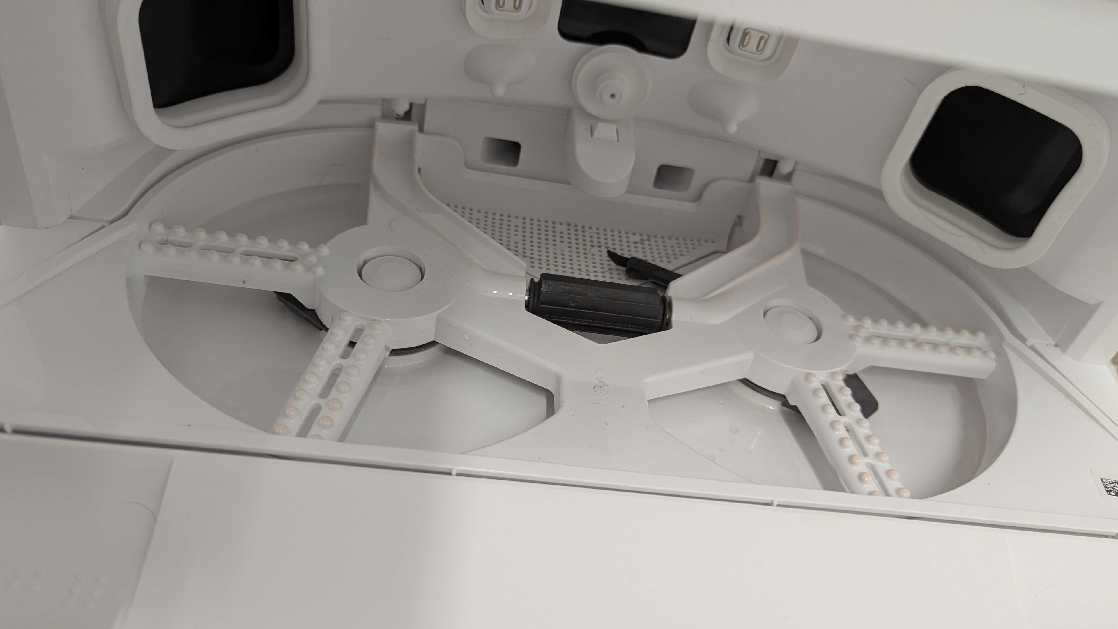 The MOVA P10 Pro Ultra feels sturdy and solidly built. It's composed of thick, premium plastic, with the wheels and brushroll made of rubber, transparent material over the sensors, silicone-covered buttons, and a side brush made of synthetic fiber. The robot vacuum has a glossy finish on the top and sides and a matte finish elsewhere. Here's a photo with the mop pads removed. The dock is almost entirely glossy white plastic, even the mop cleaning tray. The only weak area is the hinged top lid on the robot vacuum—the hinges are a little unstable when the lid is open.