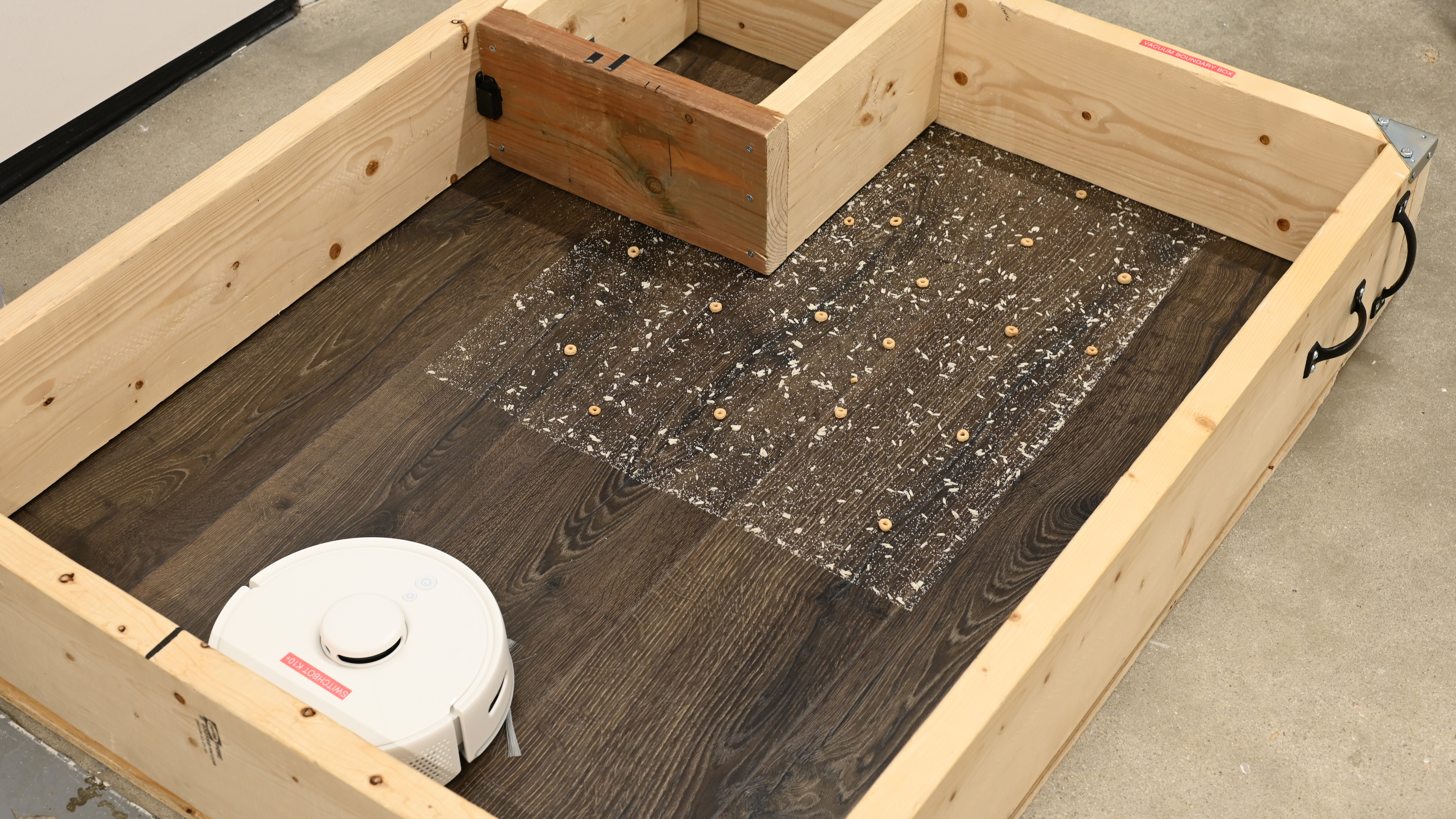 Since the dustbin quickly overfills and leaves material behind when the robot vacuum is picked up, we tested this with less material but the same proportion of fine, medium, and large debris. The results were about the same; there's still a lot of fine material left along wall edges and in corners.