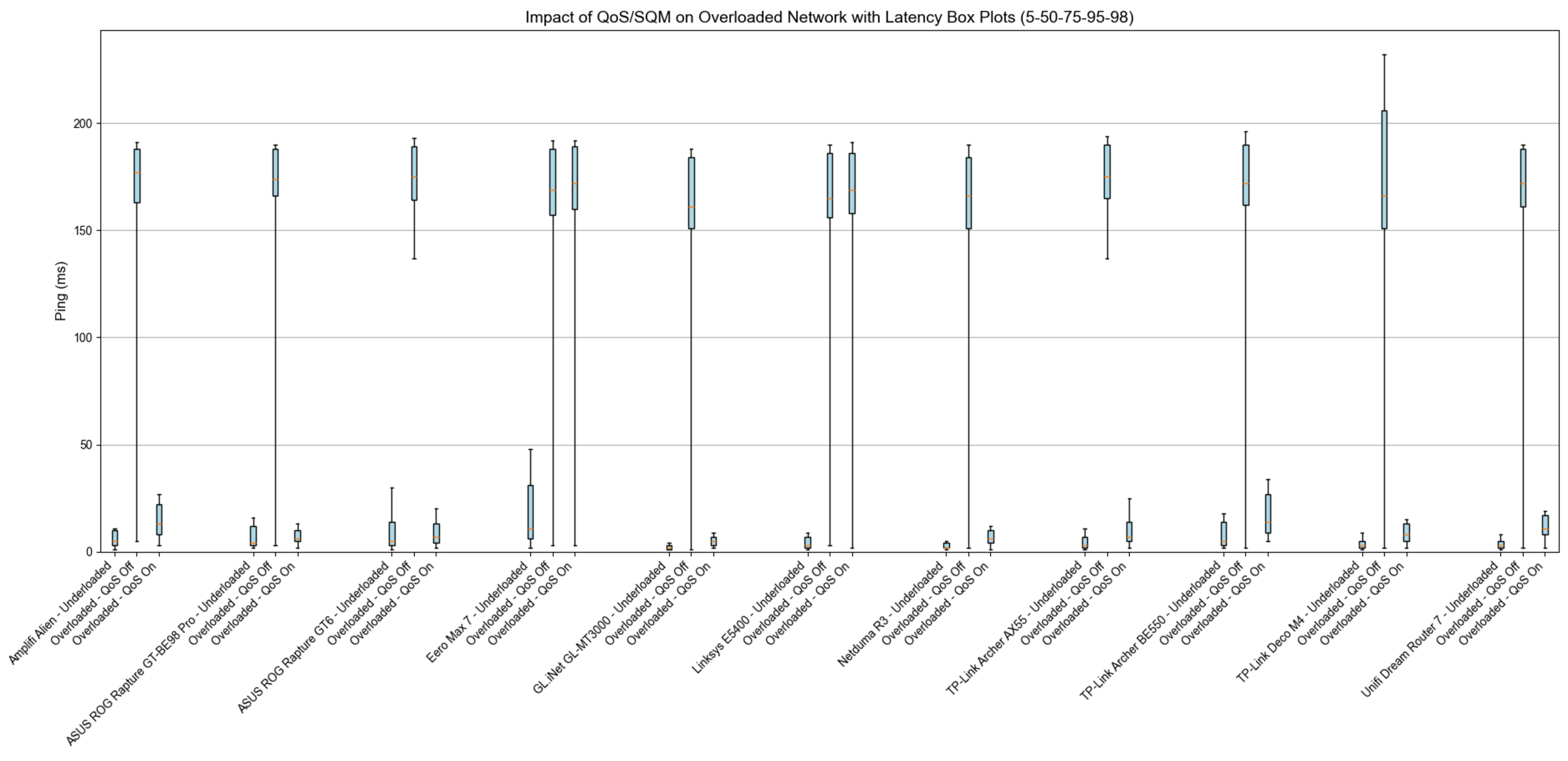 Keep in mind that the results in this graph should not be taken as quantitative data; trends are more important than direct numbers. This is because we didn't take the time to optimize the QoS/SQM settings; we simply confirmed the feature was working, and we were willing to sacrifice our download speeds to achieve that goal. So even if one router's QoS/SQM might look better on the charts, another's might have been better with more time spent fine-tuning its settings.