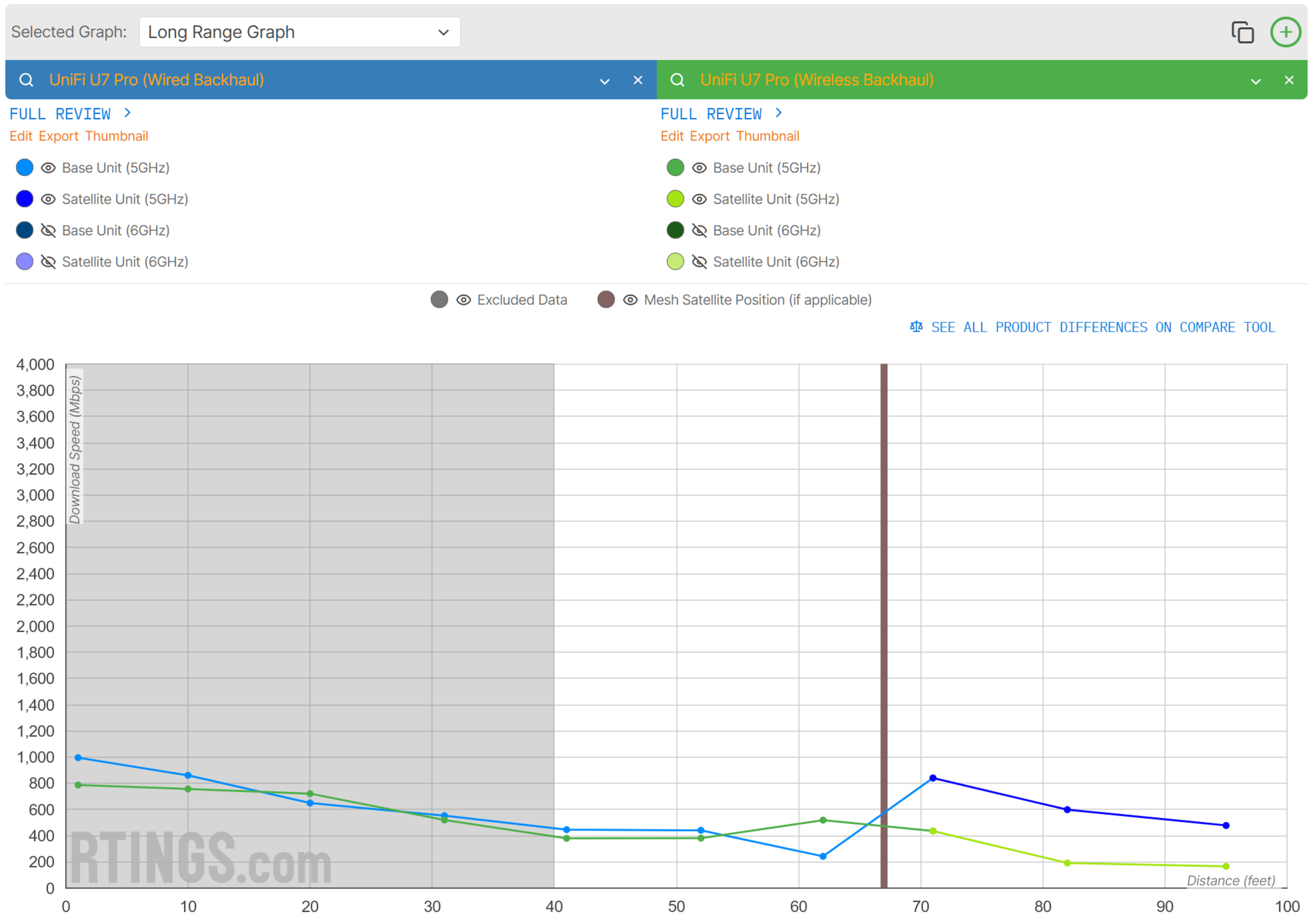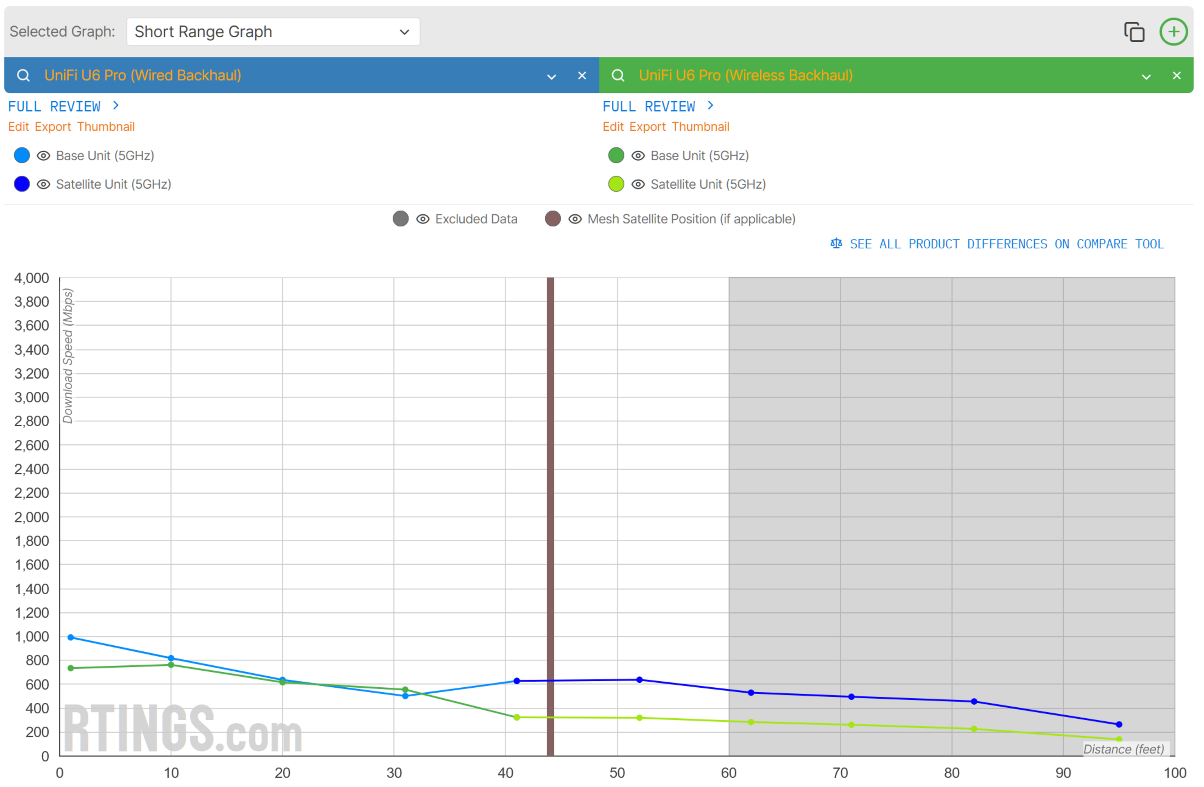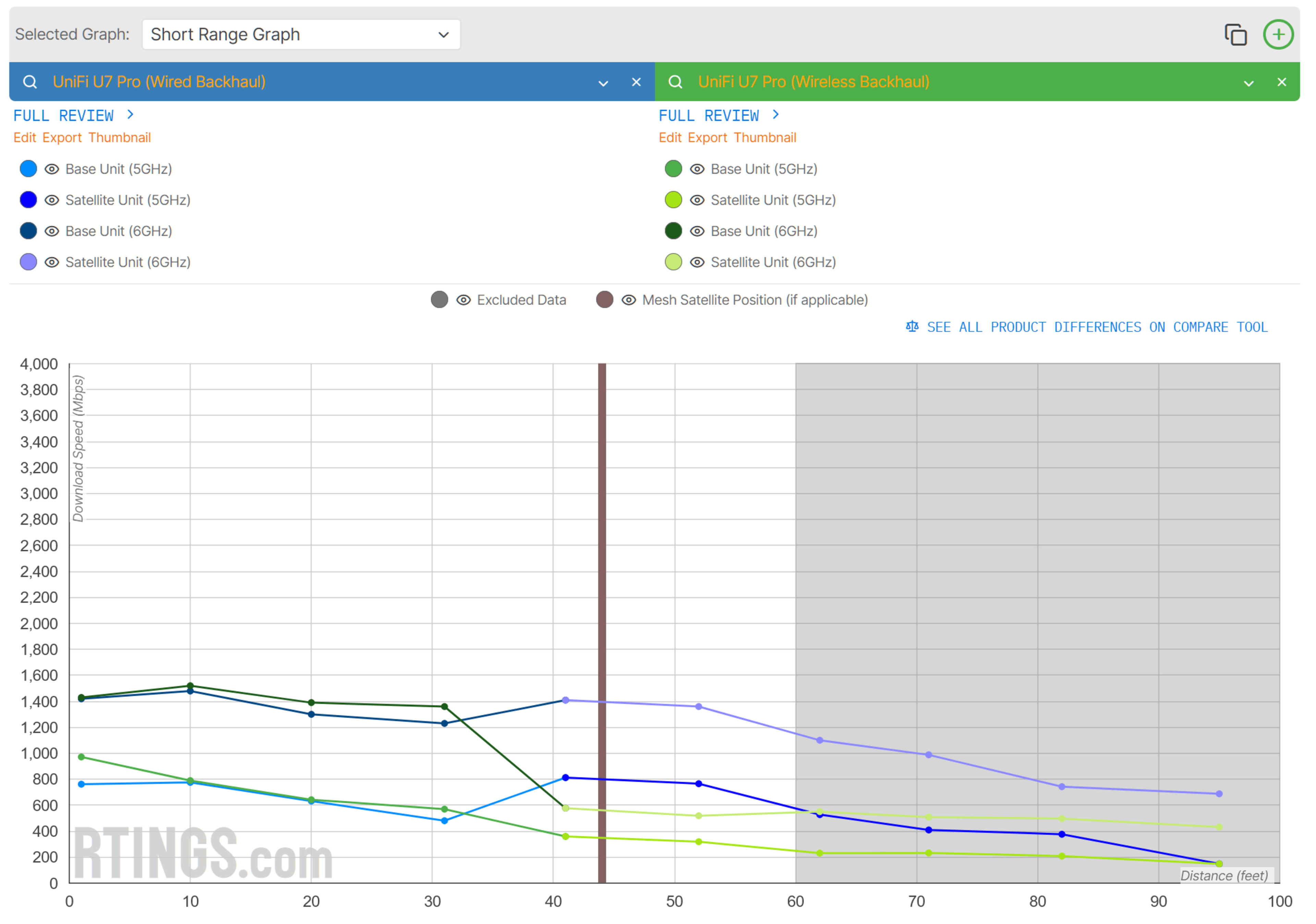 Placing the AP at the 44-foot mark for our short-range test is another clear example of how effective using a wired backhaul is. The speeds stay consistent and maintain a linear reduction in speed compared to the penalty present when switching to the U7 Pro with wireless backhaul.