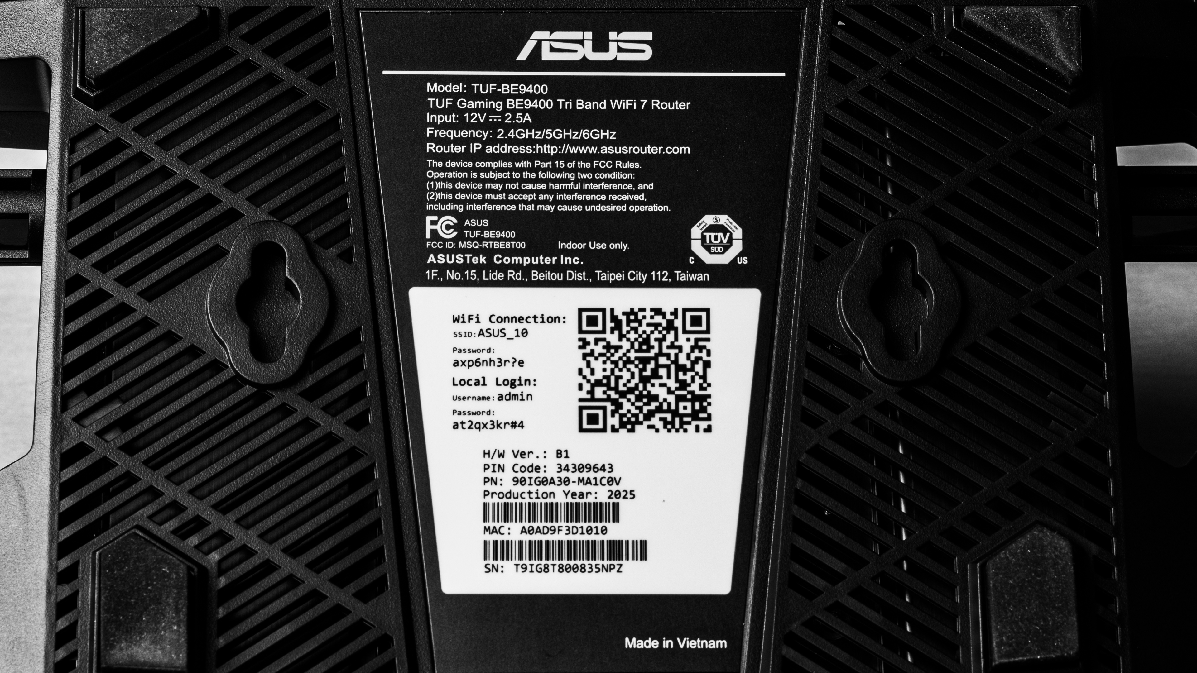 The ASUS TUF Gaming BE9400 is a standalone tri-band Wi-Fi 7 router with 2.4GHz, 5GHz, and 6GHz bands. It has six 2.5Gbps Ethernet ports (one WAN and three LAN) housed in a stylized hexagonal chassis, with four movable antennas along its back and sides. It includes a USB-A 3.0 port for network storage and mobile tethering. It also supports ASUS's AiMesh technology, so you can pair it with other compatible routers to create a unified mesh network. You can configure the BE9400 using the ASUS Router app or via its web interface.