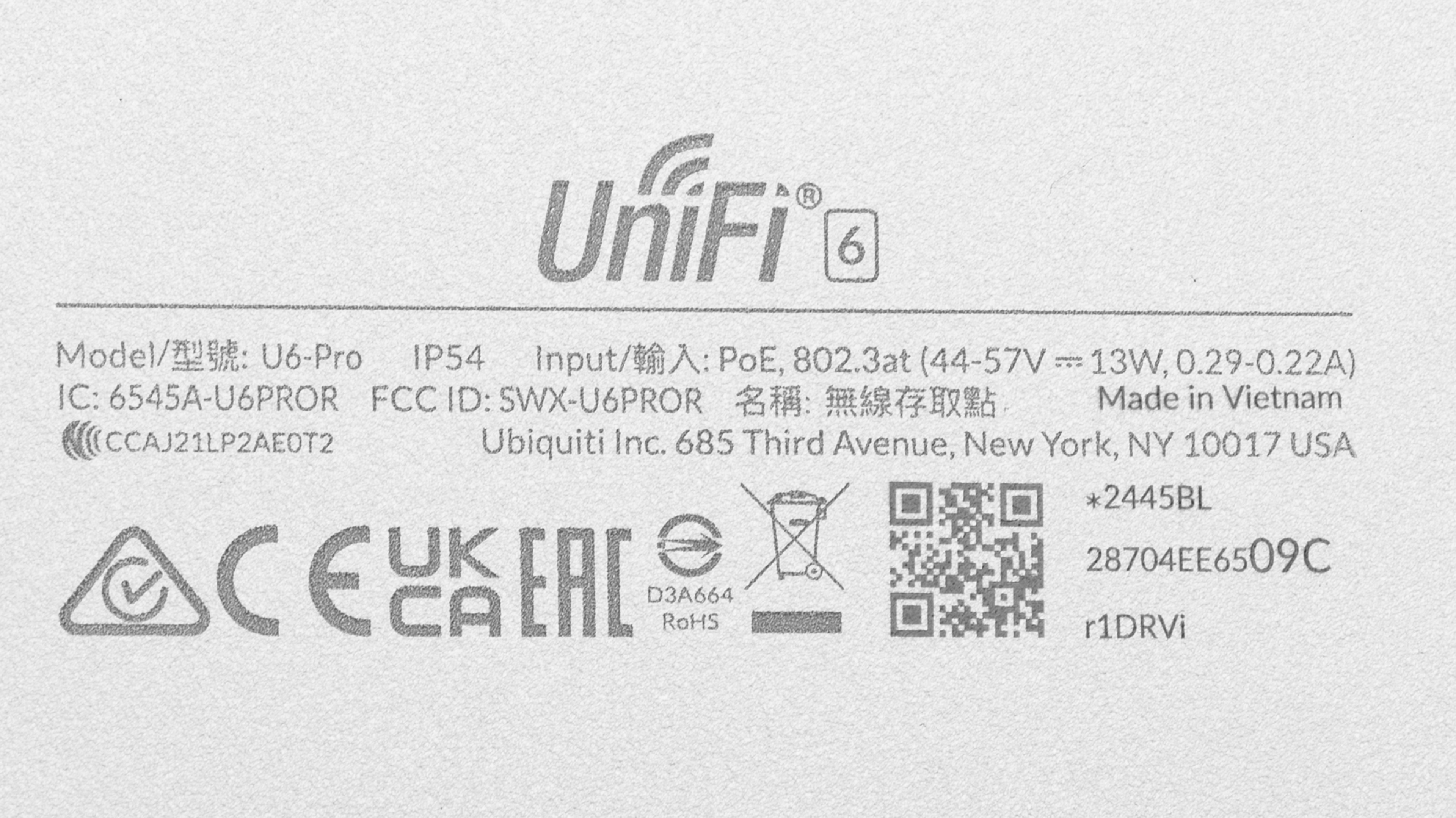 The UniFi U6 Pro doesn't have any variants. Accessories like a paintable polycarbonate cover and a wall-mount arm are available from Ubiquiti. You can see a photo of our unit's label here.