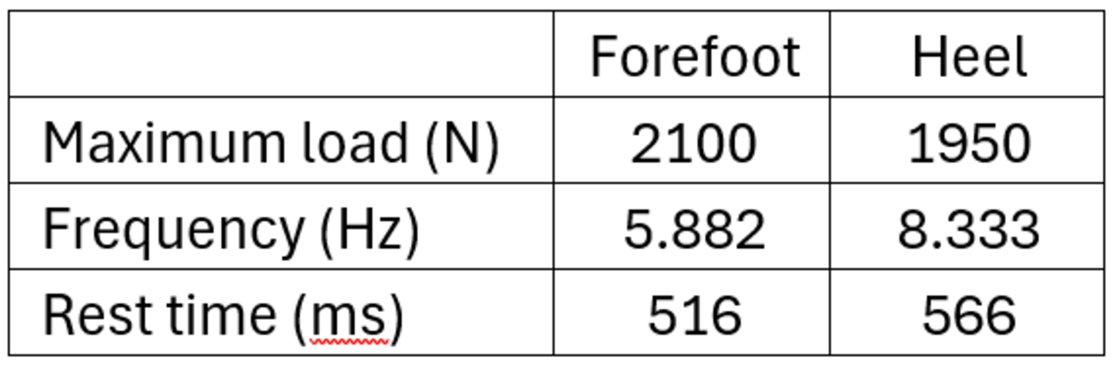 Once frequency (or contact time) was determined, calculating the rest time is straightforward, as it depends only on stride time, which is derived from cadence. We selected a reference cadence of 175 steps per minute, reflecting the typical range of 160–190 steps per minute for recreational road runners. At this cadence, the stride time, the time it takes to do two steps, is 685 ms. Subtracting the contact times leads to rest times of 566 ms for the heel and 516 ms for the forefoot.
