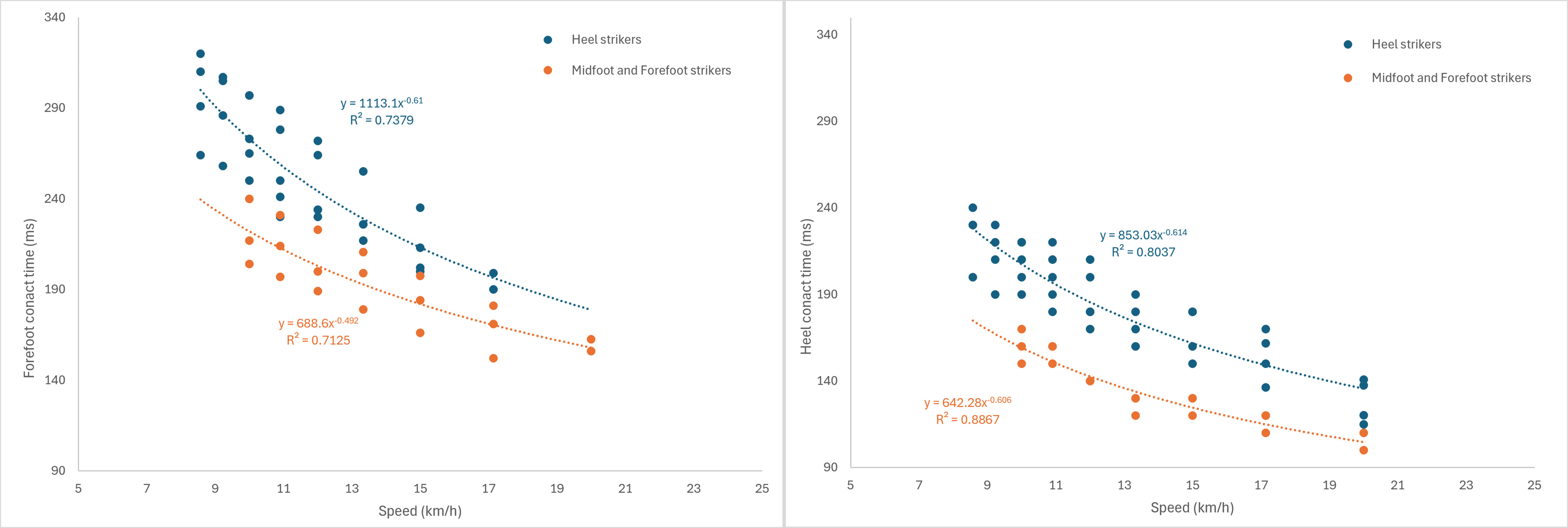 Contact time is expected to depend primarily on speed and cadence, rather than body weight. However, since no universal trend between contact time and cadence emerged in our runner pool, we simplified the modeling by using speed alone. The results led to consistent power-law relationships for both heel and forefoot. Separating heel strikers from midfoot/forefoot strikers further improved the fit. Using this approach, forefoot contact times were 158 ms for midfoot/forefoot strikers and 179 ms for heel strikers: a representative value of 170 ms was adopted, corresponding to a frequency of 5.882Hz. Applying the same method to the heel led to a contact time of 120 ms or 8.333Hz.