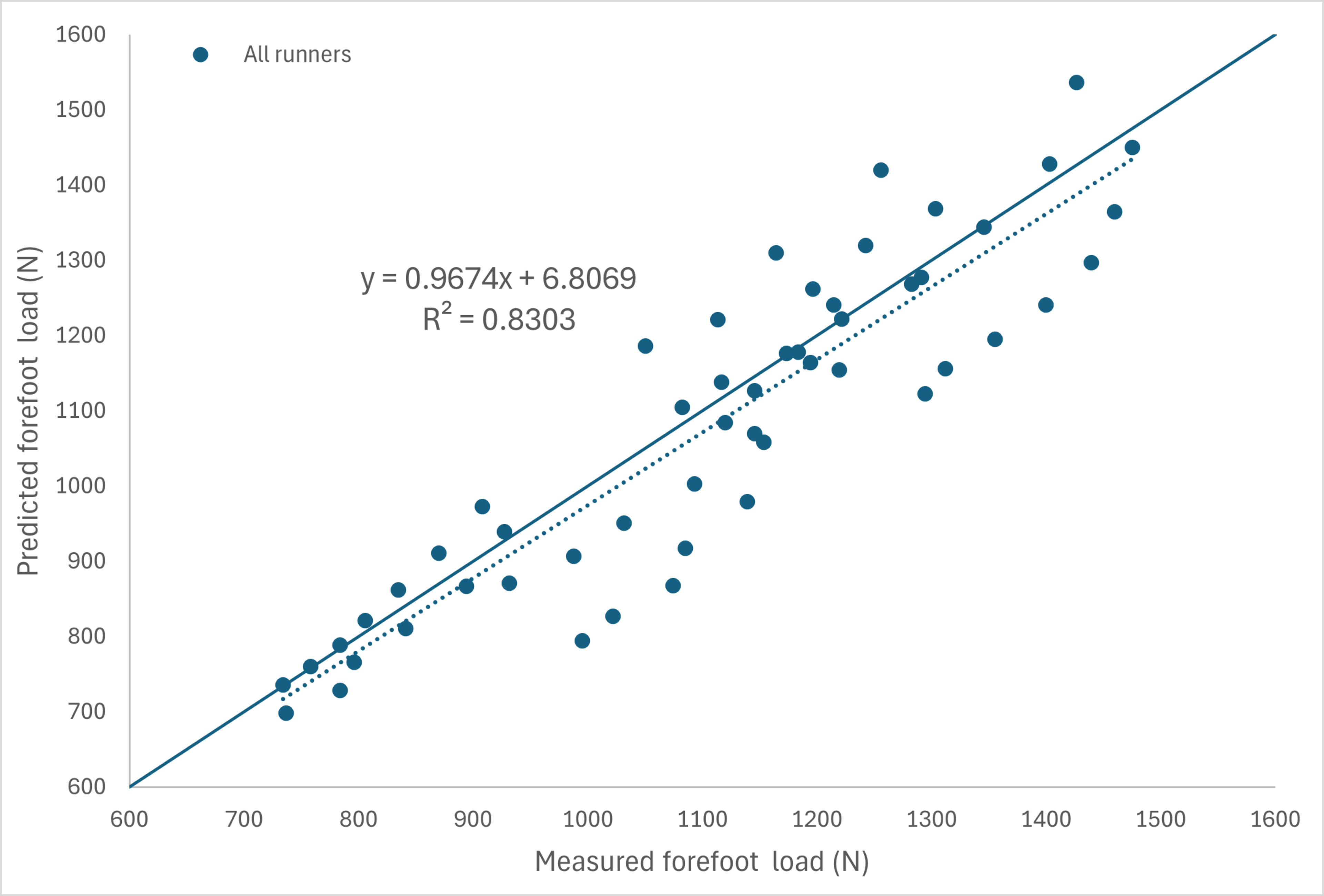 By comparing the loads predicted by this equation with the loads measured by the insoles, it can be concluded that the agreement was strong. The trendline had a slope close to one, the intercept was only 6.8 (close to zero), and the R² value was 0.83, showing a good match between modeled and measured loads.