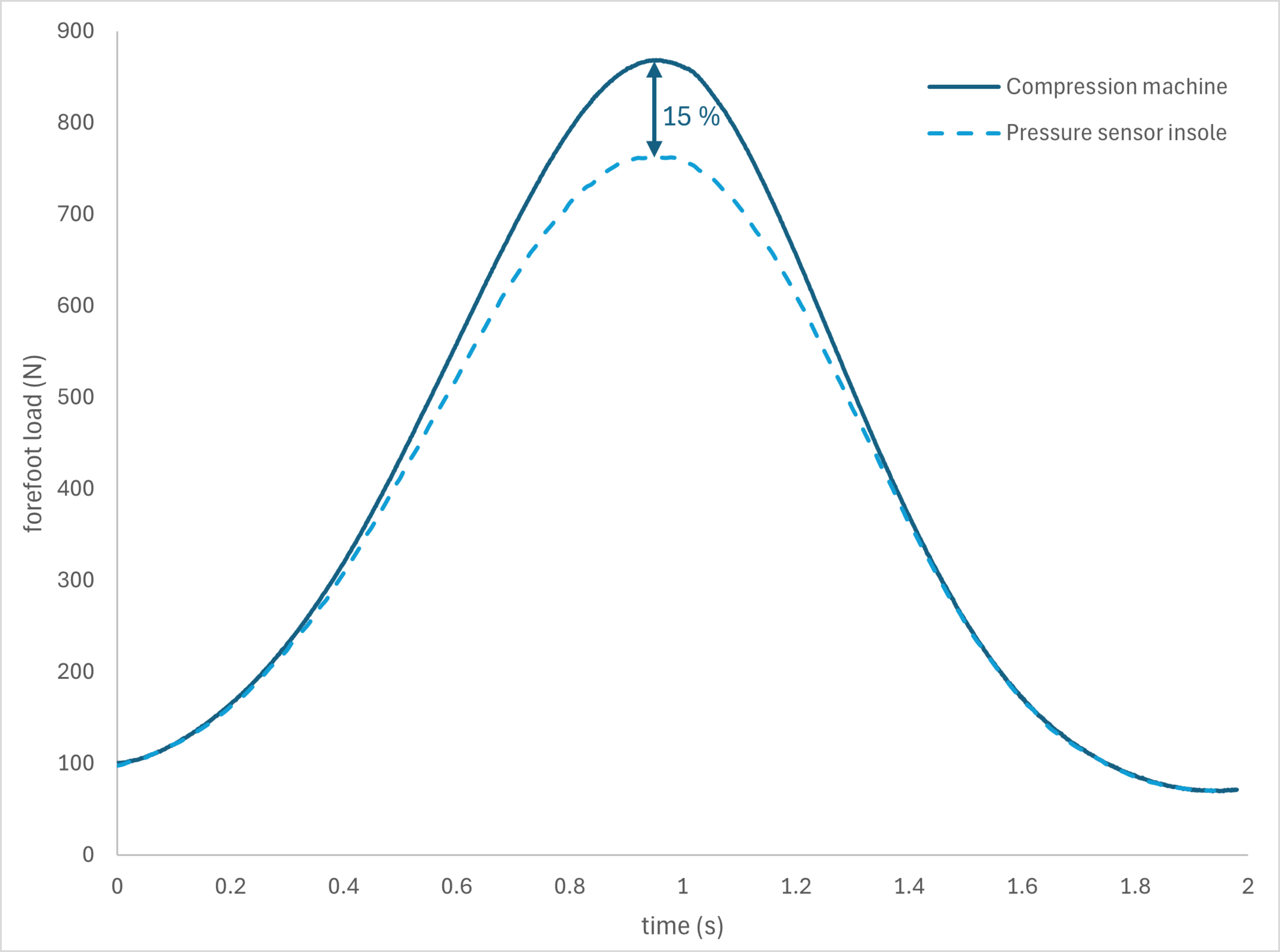You may notice, however, that the values shown in the tables are slightly higher than those reported in this section. For example, according to the equation above, an 85 kg runner at 7:00 min/km should generate about 1,100 N of forefoot load, while the introduction mentioned 1,250 N. This difference comes from a systematic 15% offset between the load measured in our testing machine and the load recorded by the insole. To quantify this, we placed the insole on a midsole during compression tests at different set loads and compared the peak loads recorded by both systems.