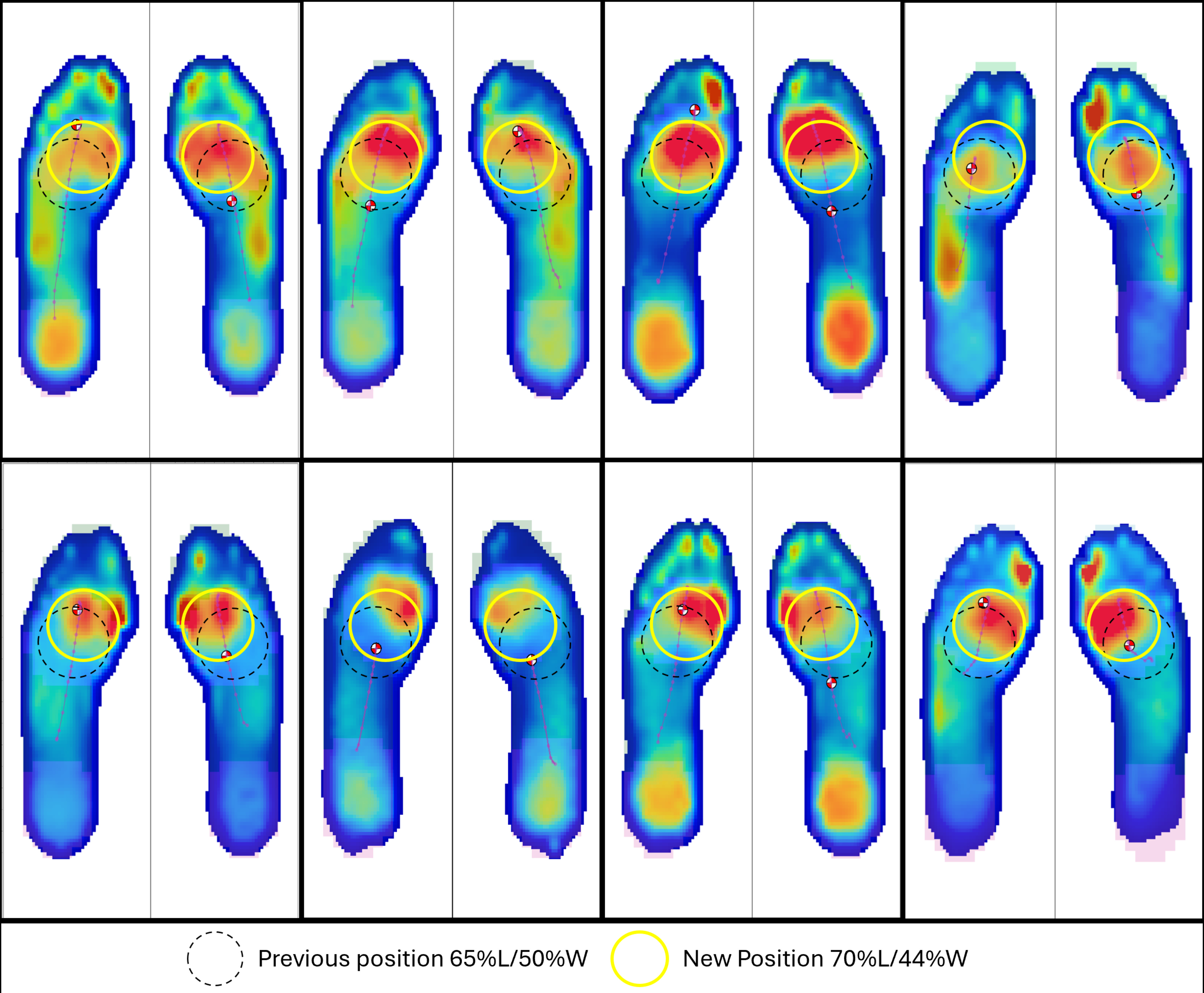 In the heel, the original placement at 12% of shoe length was validated by the pressure maps and therefore remained unchanged.