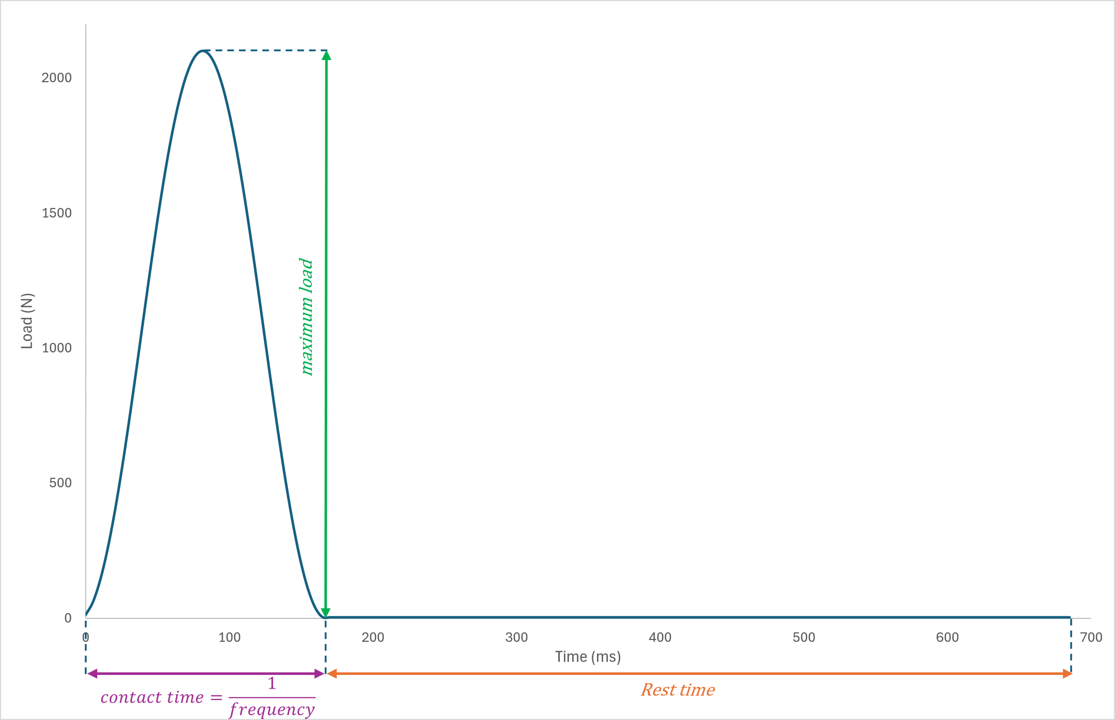 Additionally, even by matching the maximum load, our previous tests used a sinusoidal profile, whereas the actual insole-measured load over time resembles a haversine profile, a sine wave followed by a pause. In practice, a runner applies force while the foot is in contact with the ground, followed by a period of no contact during flight and when the opposite foot takes over.