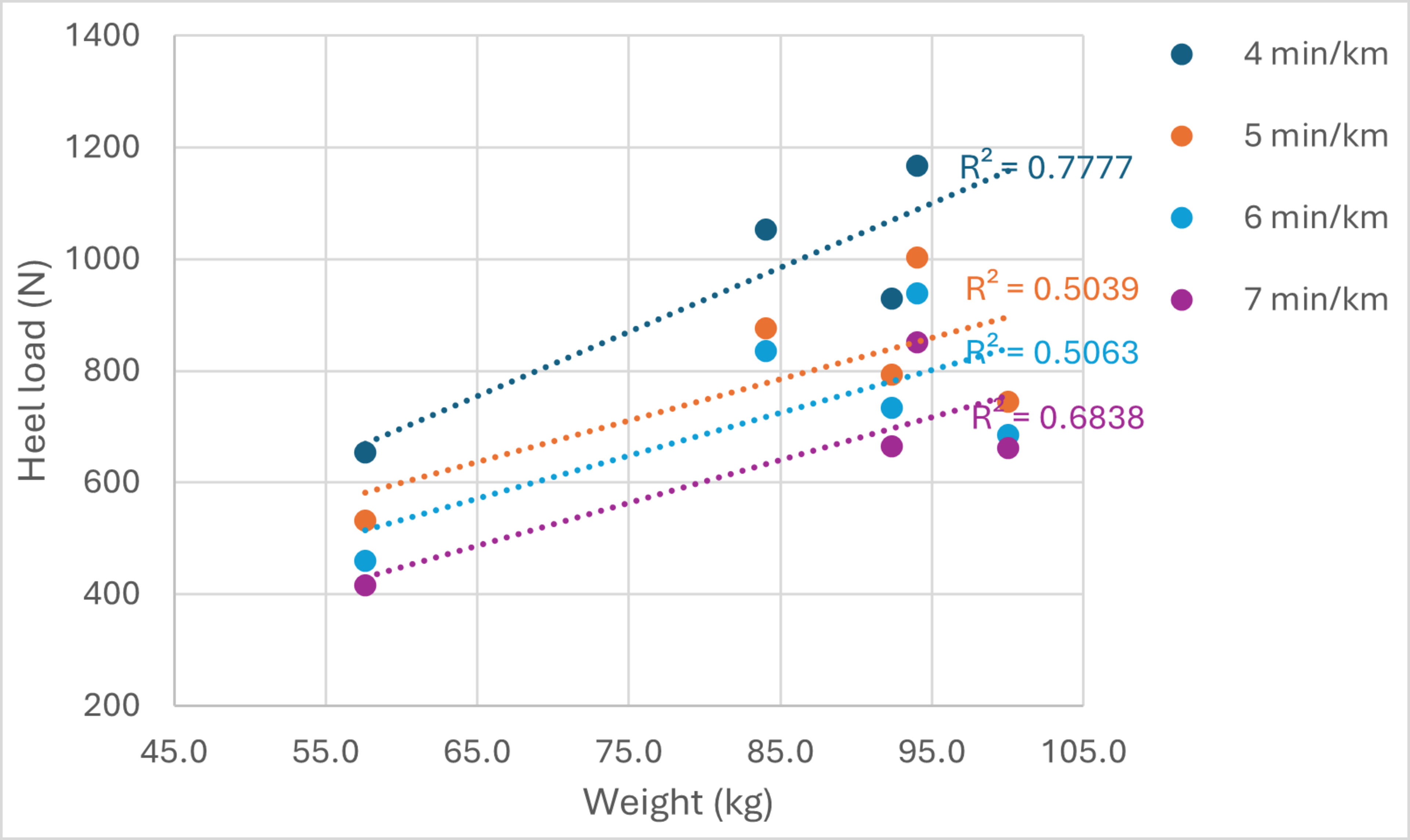 These results and the modeling process formed the load tables introduced earlier and are designed to guide runners in selecting their next pair of running shoes. Table values are rounded to the nearest 50 N, reflecting the expected accuracy of the model.