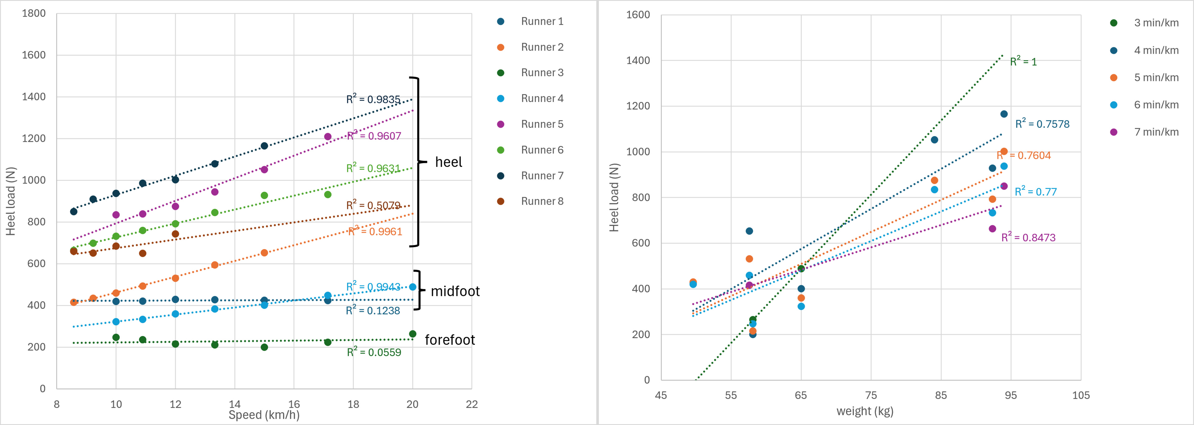 Modeling heel load proved to be more complex. Plotting load as a function of speed for each runner revealed that trends were highly dependent on foot strike pattern. As expected, heel strikers (runners 2 and 5–8) apply more force on the heel than midfoot or forefoot strikers (runners 1, 3, and 4).