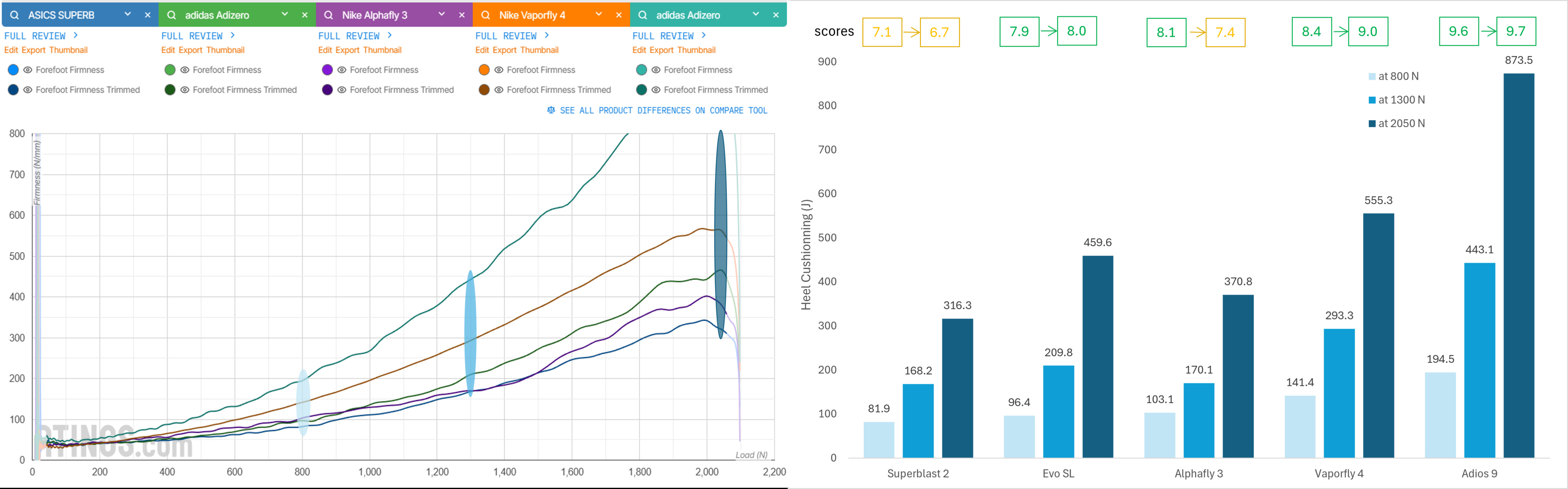 Despite these changes, general trends between shoes remain consistent. For example, the Nike Alphafly 3 still exhibits high energy return, while the HOKA Clifton 10 remains comparatively low. Scoring has been adjusted to maintain consistency with previous results, so overall ratings are largely unchanged. Some close-scoring shoes may switch positions: for instance, the adidas Adizero Evo SL previously scored higher than the Alphafly 3, but the order is now reversed in both heel and forefoot. That said, those two still score pretty close to each other with only a 0.2 score difference, indicating both have good energy return in the same range.