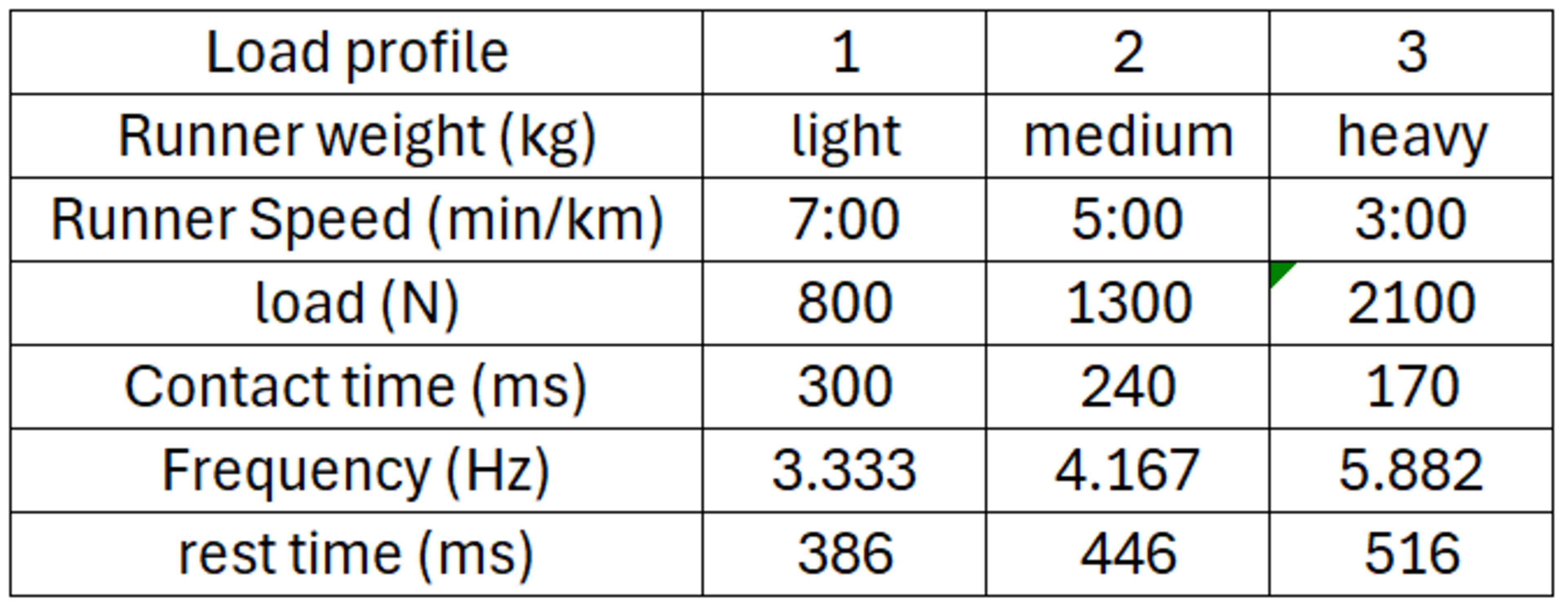 The load profile's frequency of the sinusoidal part is the inverse of the foot's contact time in the area of interest, which can be measured using the pressure sensor insoles. For this part of the work, the goal wasn't to model contact time with high precision for each runner, but rather to establish a representative value for a runner at 3 min/km.