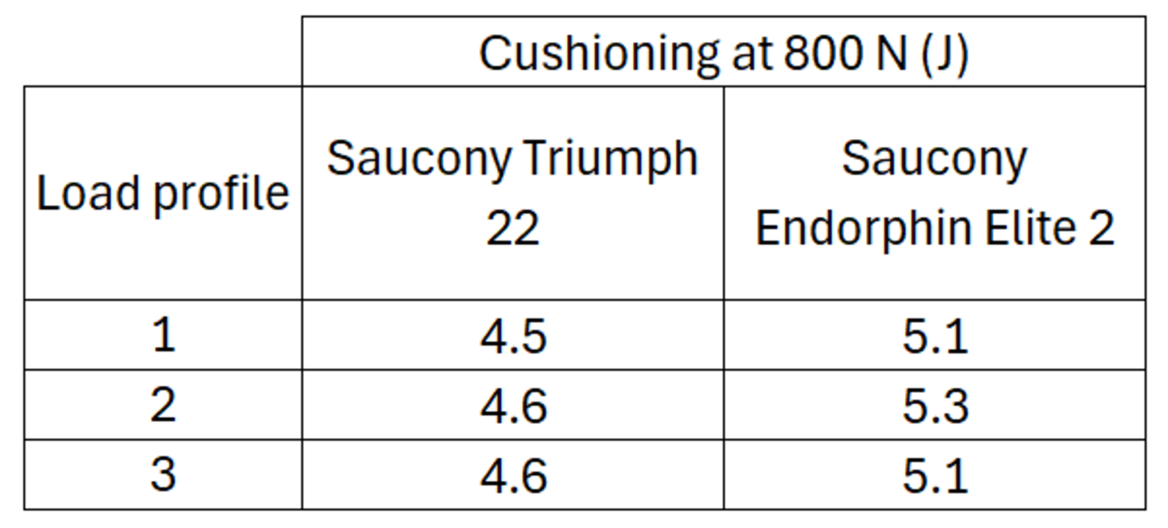 The results showed that cushioning was highly consistent across profiles, with a maximum difference of only 0.2 J. This means cushioning values at 800 N for a light runner at a slow pace can be reliably taken from any load-displacement curve, even one modeled for a heavy runner at a fast pace.