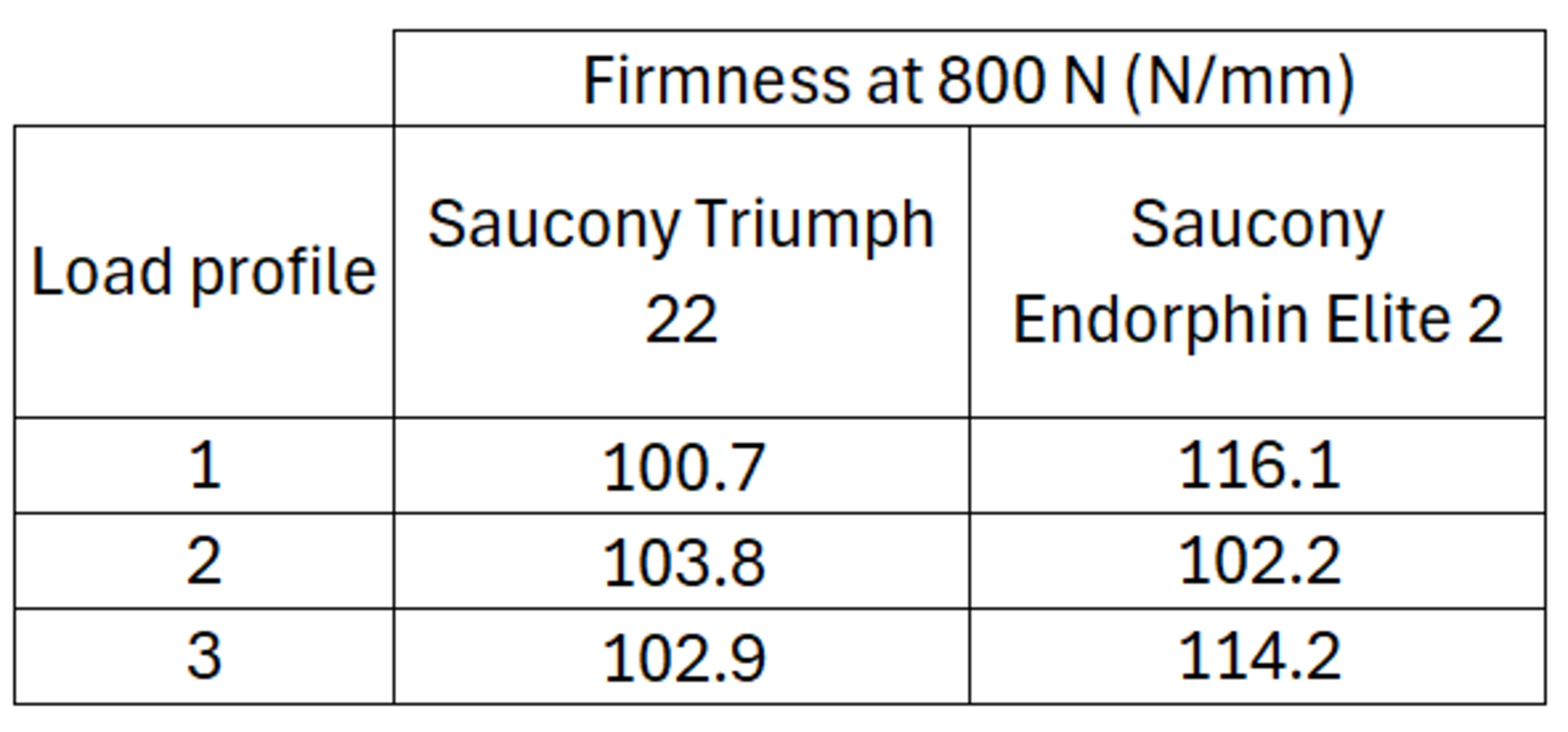 Firmness showed slightly more variation, with a maximum difference of 14 N/mm in the Saucony Endorphin Elite 2. However, this remains reasonable considering that firmness at 800 N across the first 10 shoes tested ranged from 82 to 194 N/mm. For other shoes, such as the Saucony Triumph 22, firmness was very consistent across all profiles.
