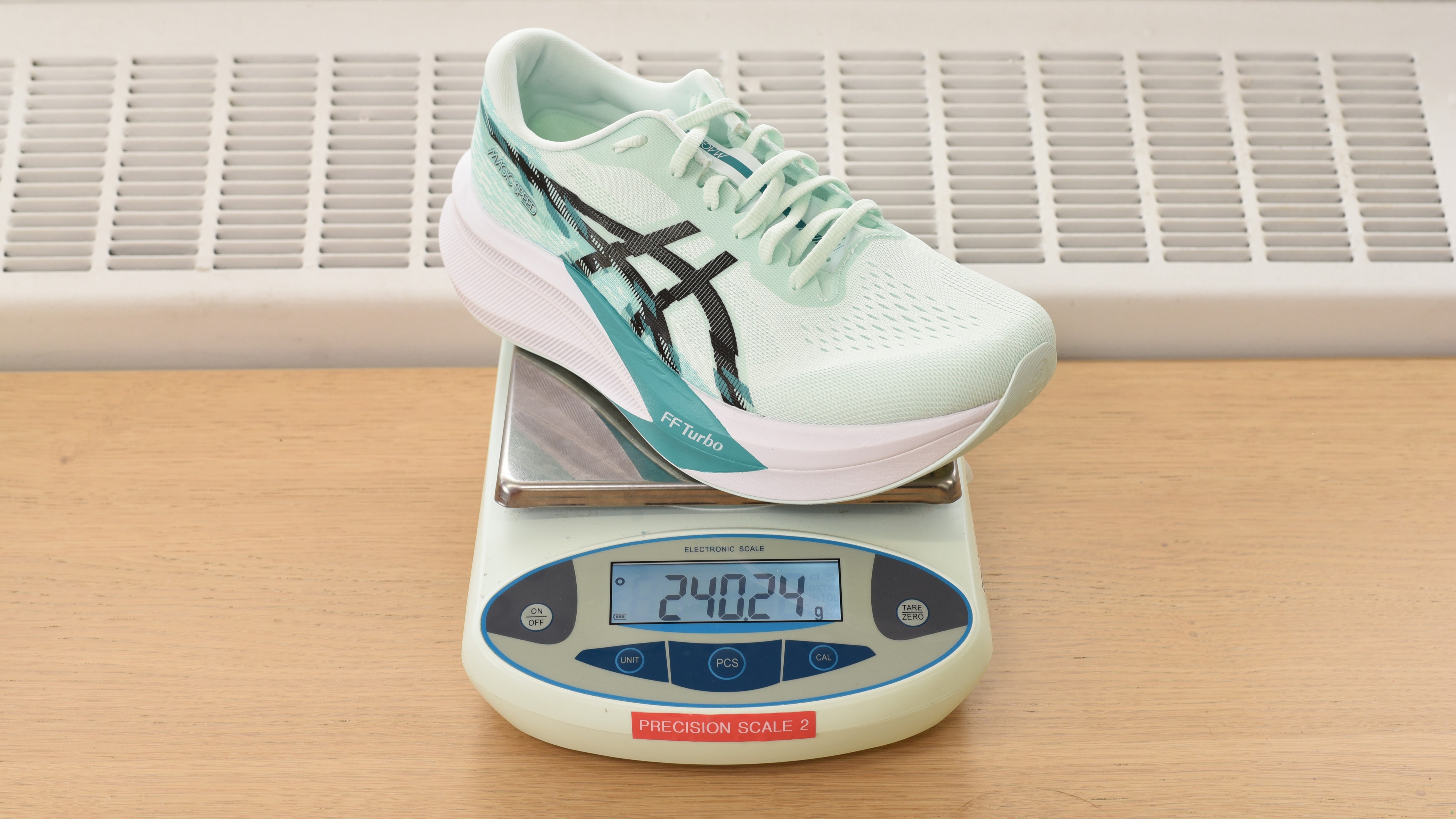 We bought and tested the ASICS MAGIC SPEED 4 in men's US size 9, as noted on the label for our pair. The pair we purchased is the Soothing Sea/Black colorway, but you can also buy the shoe in a few other options depending on the region, including White/Black, Flash Red/White, Black/Winter Sea, and Black/Tranquil Teal. This model is only available in regular width. The design section applies only to the exact model we tested, but we expect other sizes and gender variants to perform similarly.