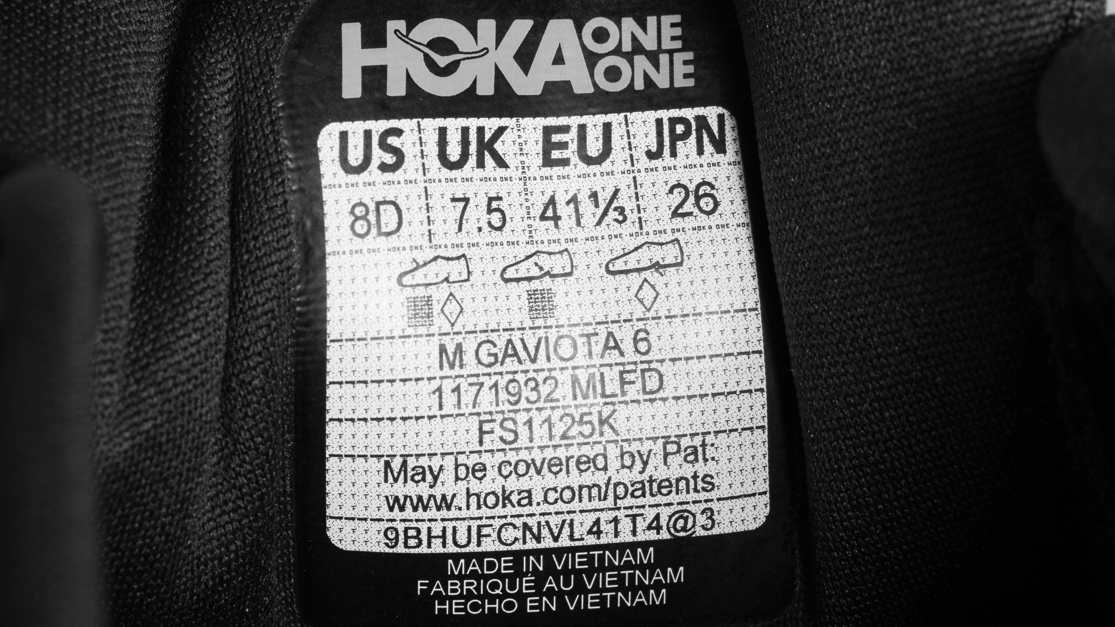 We tested the HOKA Gaviota 6 in men's US size 9, as indicated on the label for our pair. The color shown here is Midnight Blue/Faded Navy, and the shoe is available in several other colorways, including Grout/Stucco, Stellar Grey/Stardust, and Birch/Yellow Gold. Wide (and extra-wide!) versions are available separately for both men and women. The design section applies only to the exact model we tested, but we expect other size and gender variants to perform similarly.