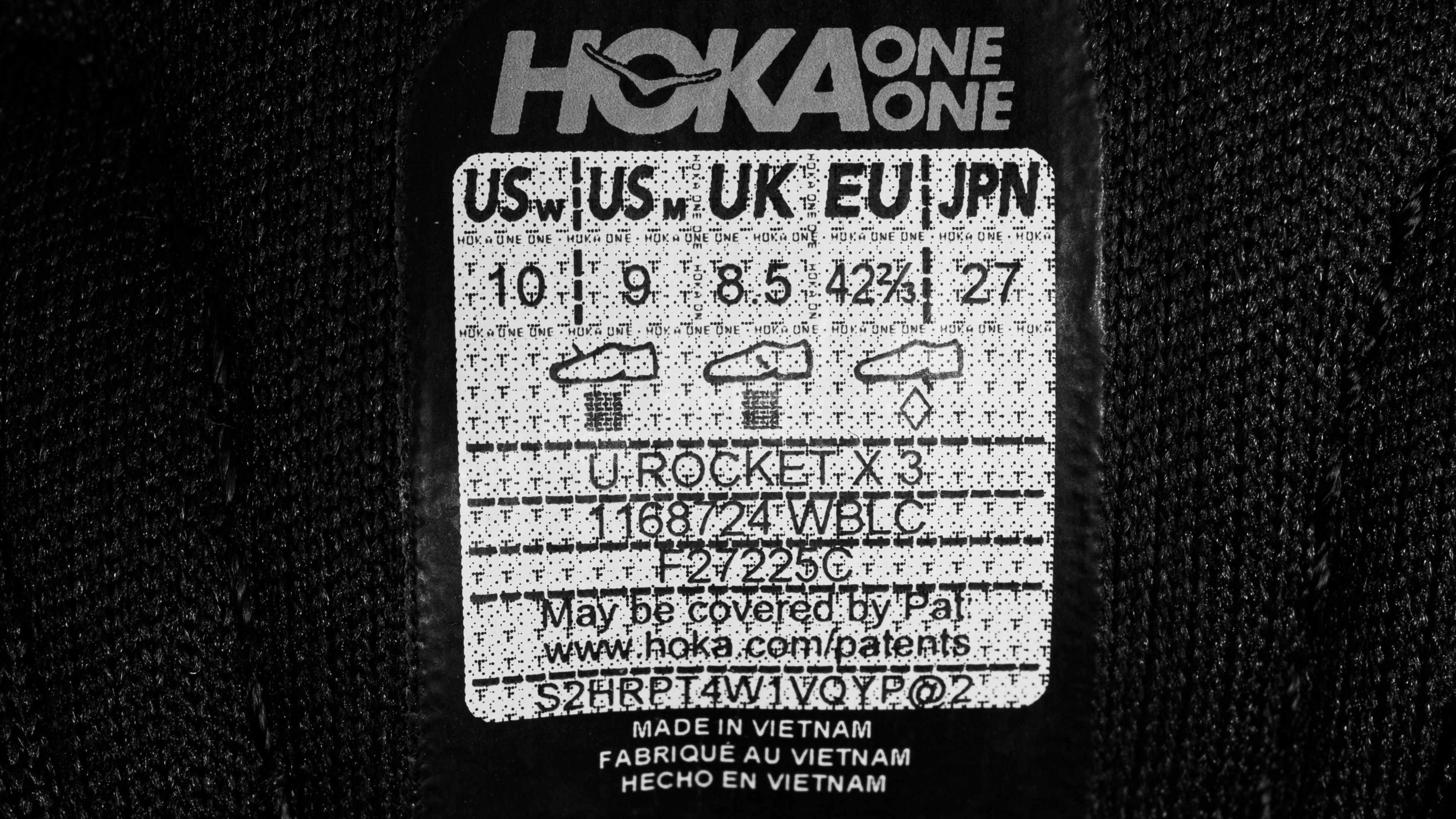 We bought and tested the HOKA Rocket X 3 in men's US size 9 as noted on the label for our pair. The pair we purchased is the White/Black colorway, which is the only option currently offered. This model is sold as unisex with corresponding men's and women's equivalents listed. No wide widths are available. The design section applies only to the exact pair we tested, but we expect other sizes to perform similarly.