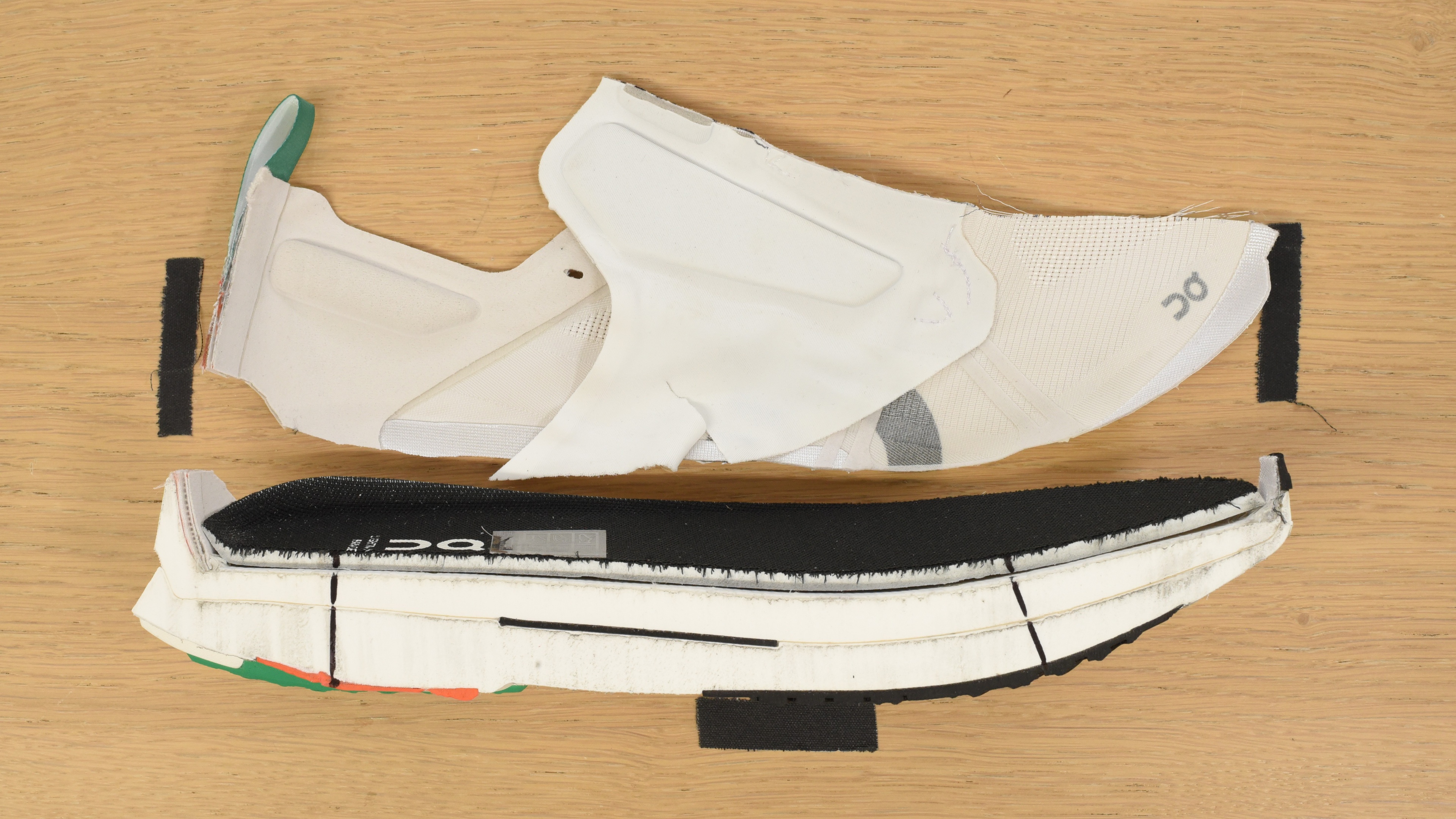 Across the midfoot the shoe uses a very small, thin plastic shank. It's similar in concept to the piece found in the adidas Adizero Evo SL, another unplated uptempo trainer, but On's shank is less large. In the Evo SL the shank helps to stabilize the soft Lightstrike Pro foam and holds the shoe together, whereas the PEBA foam in the Cloudboom Zone is already quite firm, so the functional impact here is less evident.